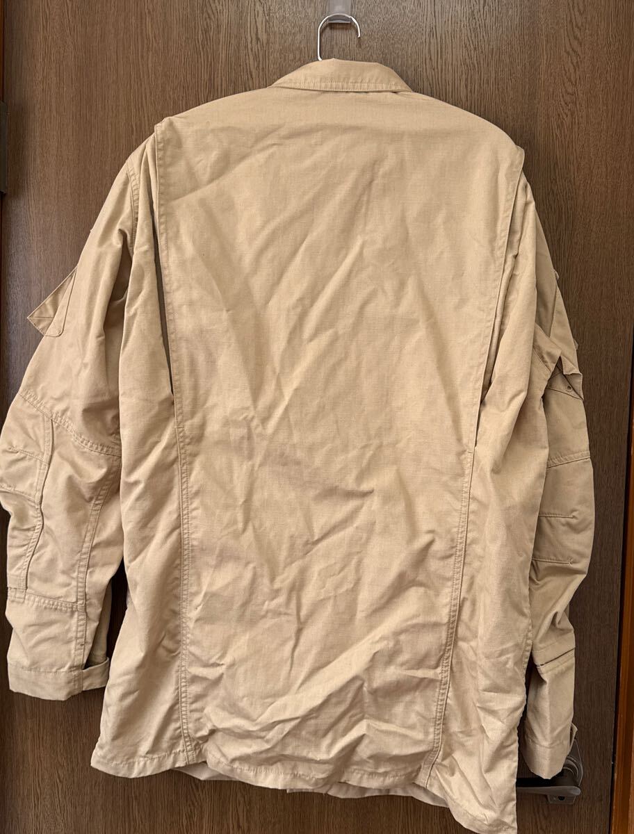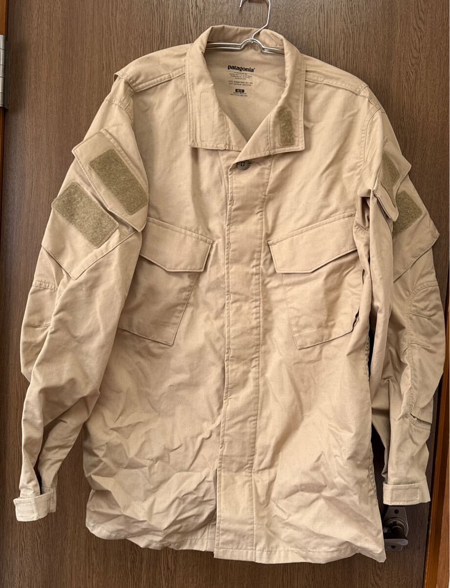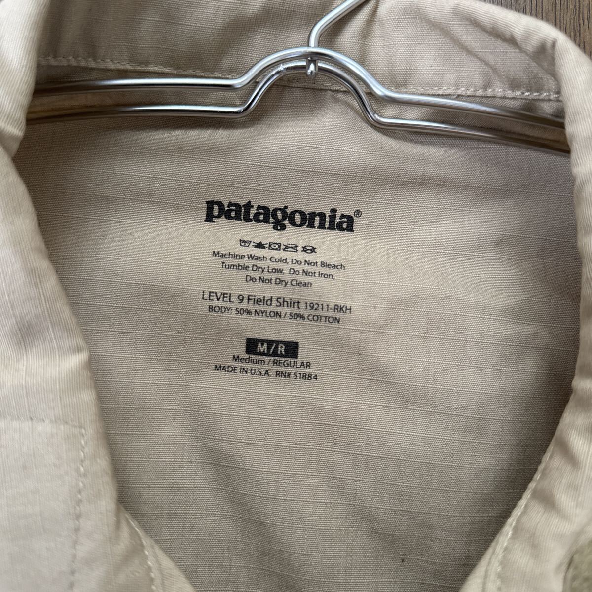 Patagonia パタゴニアのミリタリーウェア、フィールドシャツのミディアムレギュラーサイズです。色はイエローに近いカーキベージュです。出品者のスマフォでは、画像1と3は黄色強め、画像2と4は暗めに写っています。目立つシミは画像4に示しましたが、全体的に使用感は少ないです。