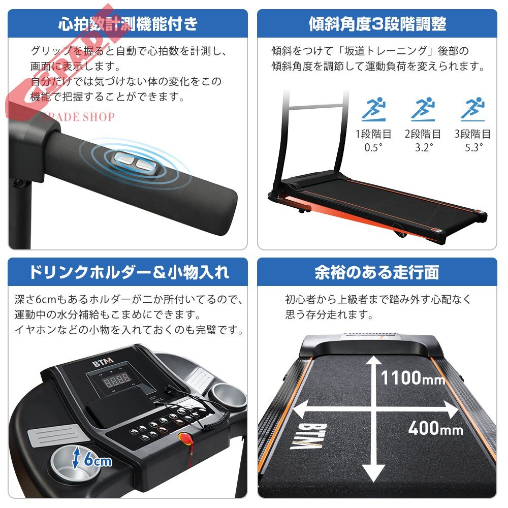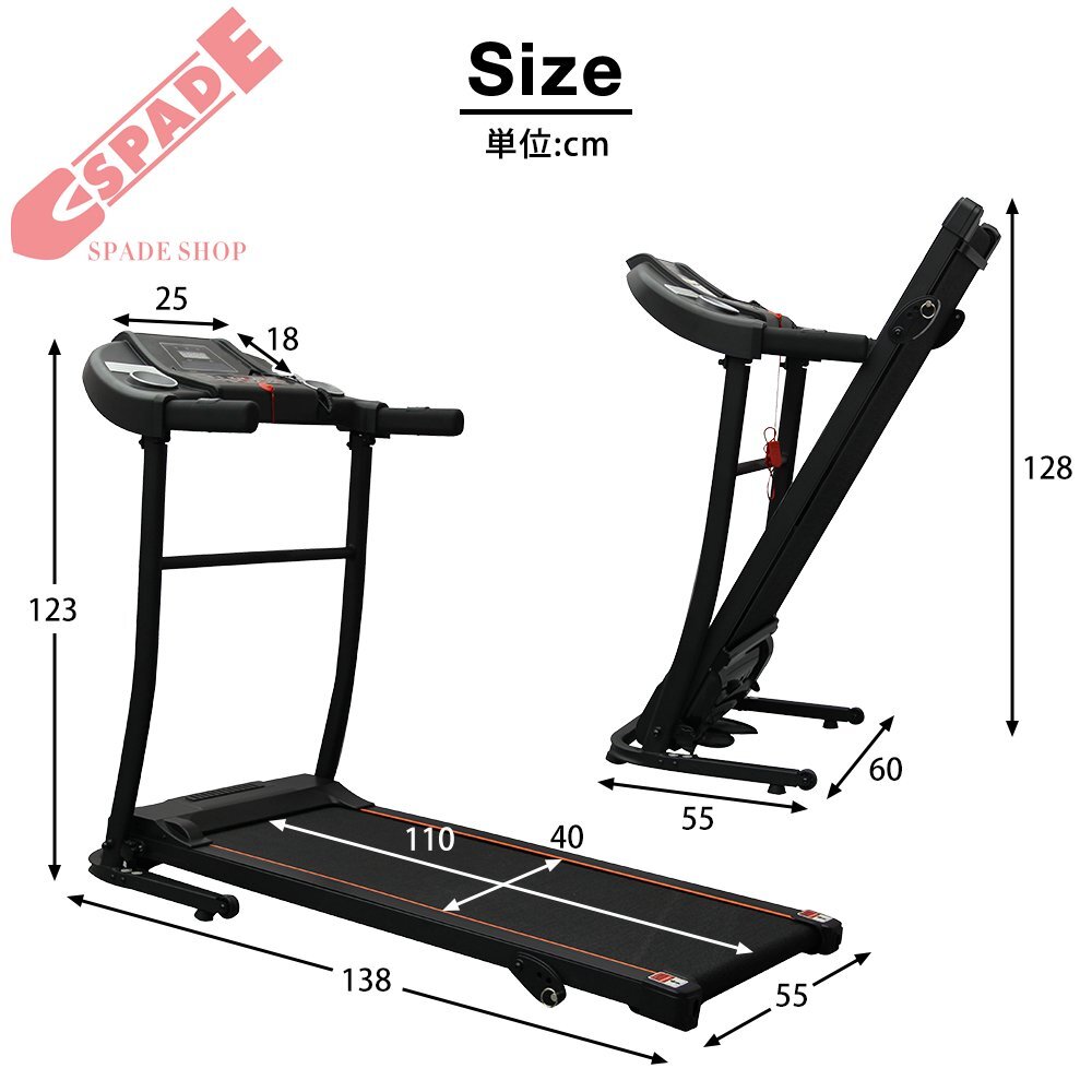 • 【広幅の走行面&自動計測機能付き】ルームランナーは5層ベルトを採用して滑り止め効果が良い、緩和騒音や振動も防ぎ、衝撃を最大限に吸収でき、関節の負担を軽減することができます。トレッドミルは約400 x 1100 mmの広幅の走行面には使用中に踏み外す心配はありません、初心者から上級者まで安全安心にトレーニングできます。走行時間、走行距離、消費カロリーを自動で計測してくれるので、トレーニングの目安にすることができます。