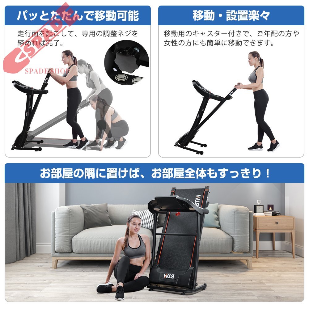 • 【折畳み式収納移動便利】折り畳み式のランニングマシンは使わない時コンパクトに折りたたんで収納しやすい、家のスペースを節約できます。また土台部分に移動用キャスターも付いて、部屋の移動も楽々です。