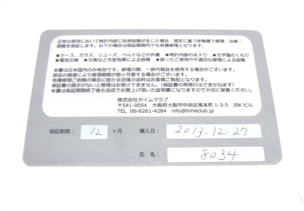 | ・店舗でも展示販売している商品の為、ご注文後に在庫確認を致しております。ご注文後、在庫が確認できない場合、ご注文をキャンセルさせていただきます。 ・電池等、消耗品の保障は行っておりません。バッテリー・電池切れの際はお客様で電池交換をお願い致します。 ・バッテリー消耗を防ぐ為、リューズ操作で時間を止めており、発送前にバッテリーチェックを行なっております。 | |||||||