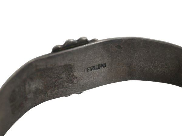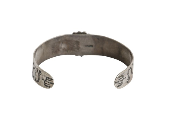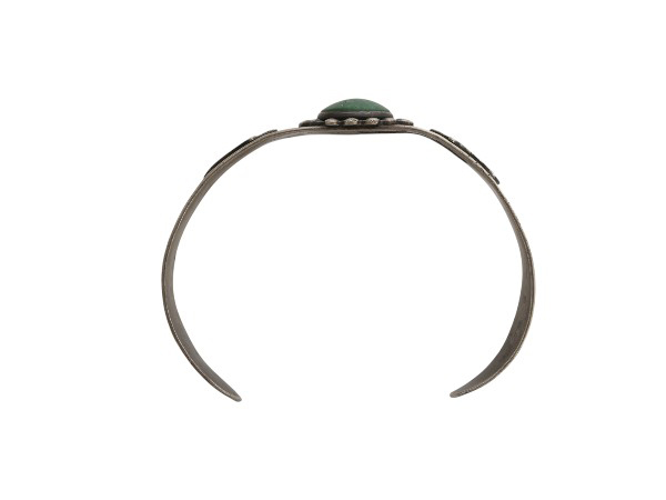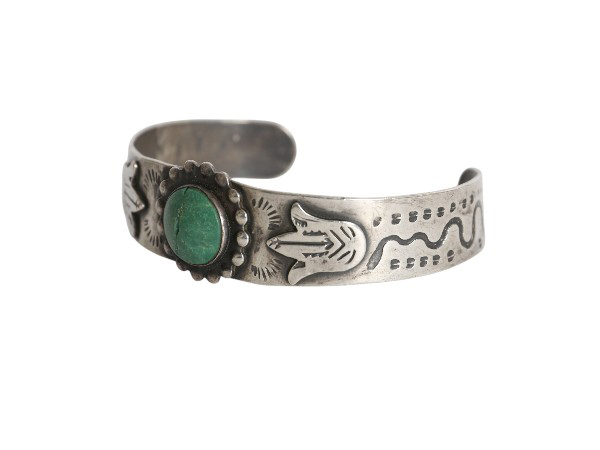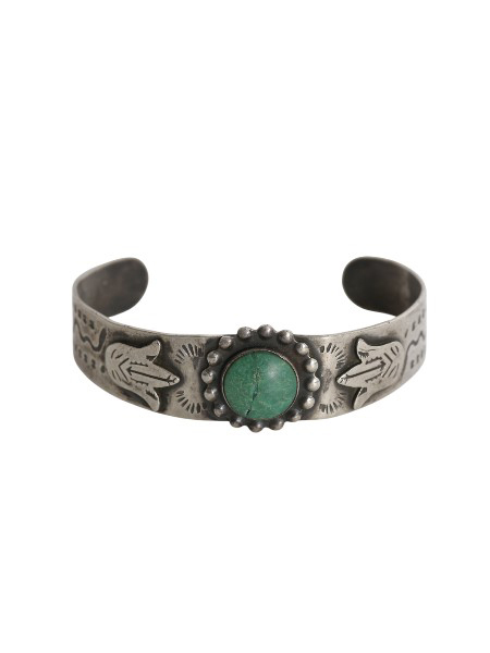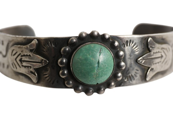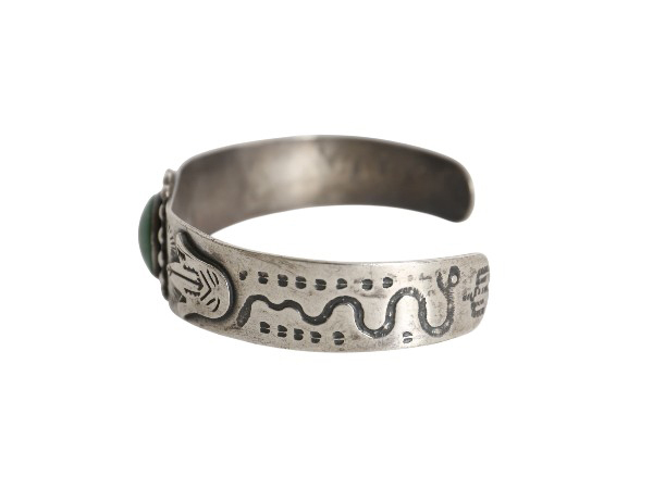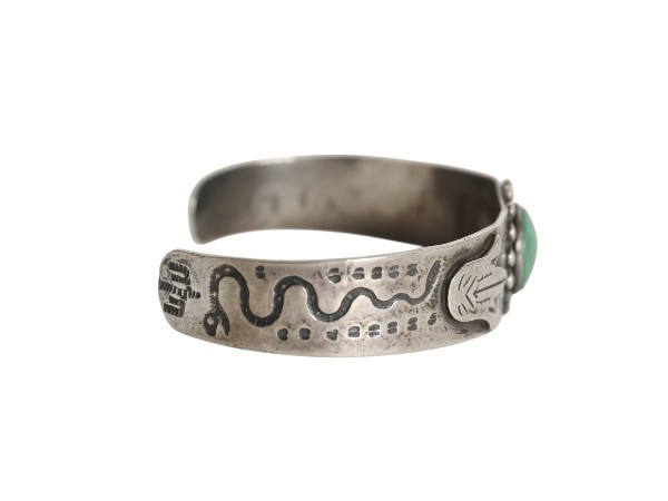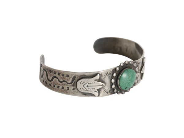 制作されたと思われる ヴィンテージ Fred Harvey Styl の シルバーバングル です。 フレッド ハーヴィー スタイル は 20世紀初頭のアメリカ南西部で人気を集めた、 ナバホ族のシルバージュエリーにインスパイアされたデザイン ホテルやレストランではお土産として販売されており 旅人などからも人気だったことから ツーリストジュエリーや、 コマーシャルジュエリーとも言われています。 バンド(地金)は、フロントからターミナルにかけて 若干テーパーするクラシックなシェイプ バンドを含めたシルバー部分には、 スターリングシルバーが使用されています。 ( STERLING の刻印入り) センターに、淡いマトリックス入りの グリーンターコイズがマウントされた フラワーコンチョのアップリケ その両サイドにアローモチーフのアップリケ アップリケ自体に細かいアローのスタンプ入り 守りや目標の意味合いを持つ人気のモチーフ サイドからターミナルにかけて、 知恵・再生・挑戦等を意味する神聖な存在 人気のガラガラヘビ(ラトルスネーク)や アメリカ先住民の神話等に登場する伝説上の鳥、 幸せを運ぶとされるネイティブアメリカンの象徴的存在 簡略化されたサンダーバード等の 温かみのある手打ちのスタンプワークが入ります。 人気のモチーフが揃った、 キャッチーなデザインで遊び心がありつつも、 ヴィンテージならではの重厚感を与えてくれる フレッドハーヴィーらしいグッドデザイン アメリカでも全く見かけません。 コーディネートの良いアクセントになる おすすめの商品です。 |