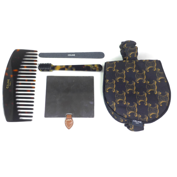 | 象徴的なトリオンフキャンバスを採用した、ライフスタイルアクセサリーコレクション「メゾン セリーヌ」のトラベルキット。 カーフスキンとのトリミングでデザインされたトラベルポーチには、ポケットミラーやカーブしたヘアコーム、トラベルサイズの歯ブラシ、爪やすり、アイマスクなどが収納されています。 ちょっとした身だしなみを整えるのにぴったりなトラベルグッズ5点セット。 飛行機などにも持ち込みやすいコンパクトサイズで、旅行や出張などにもおすすめなトラベルキットです。 |