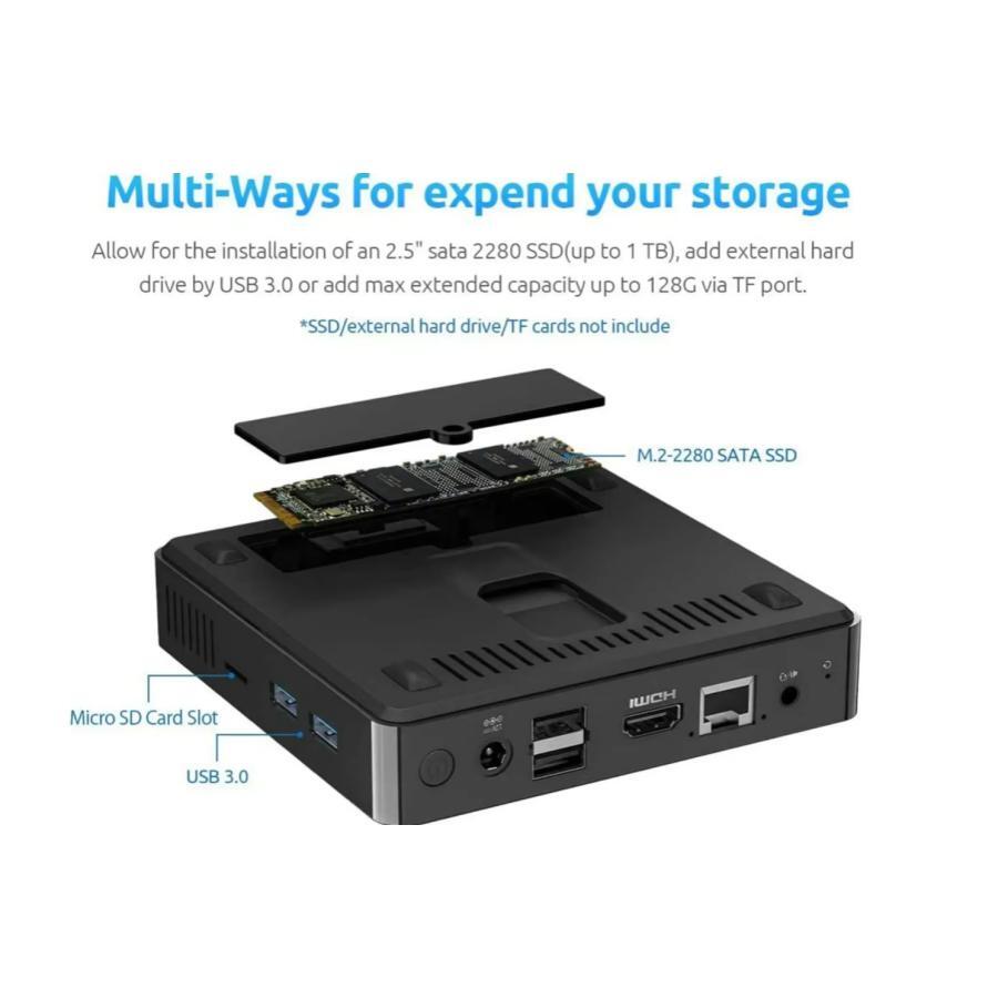 インターフェース: USB 3.0ポート×2、USB 2.0ポート×2、標準HDMIポート×1、VGAポート×1、TFカードスロット×1、イヤホンジャック×1、電源ボタン×1、DC 5.5ジャック×1、内蔵HDDスロット×1、RJ45 (PCIE RTL811H×1)、M.2 NGFF SATAスロット×1。