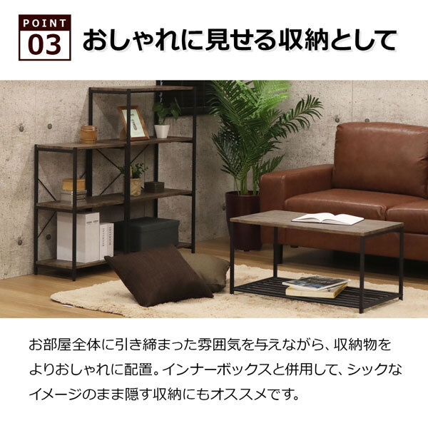 ・太いと重くなりがちなアイアン製ブラックフレームを細くしてます。・フレームはサビに強い粉体塗装を施しております。・棚板表面は木のような温もりを感じさせる、凹凸感のある造りです。・リアルな木目を再現したPVCシートは、水に強く傷付きにくいため、お手入れが簡単です。・インナーボックスと併用して、シックなイメージはそのままに隠す収納としても使えます。・脚部にはアジャスターが付いており、高さの微調整が可能です。安定性を高め、多少波打った床の上などでもぐらつきを抑える事が可能です。 ※推奨最大伸長:約5mm迄・六角レンチが付属しておりますので、組立時の工具の準備が不要です。■商品情報・製品サイズ(約):幅60×奥行30×高さ70cm(3段)・内寸(約):幅57×奥行26.6×高さ28.4cm(3段の上下段共通)・製品重量(約):7.25kg・高さ70cm(3段)・耐荷重(約):棚板1枚あたり/20kg・主材:MDF(PVC張り)、スチールパイプ(粉体塗装)・付属品:六角レンチ・生産国:中国・お客様組立品・軍手のご用意、またお二人での組み立てをお勧めいたします。