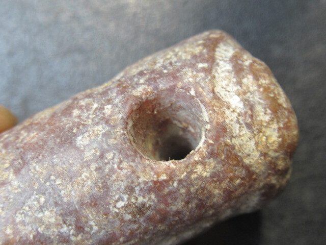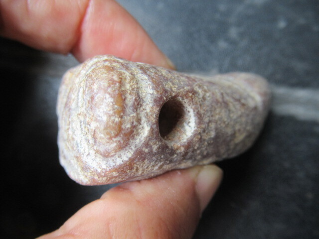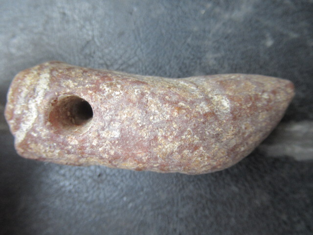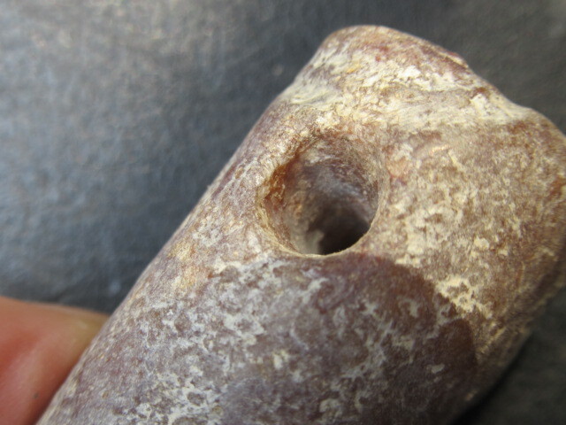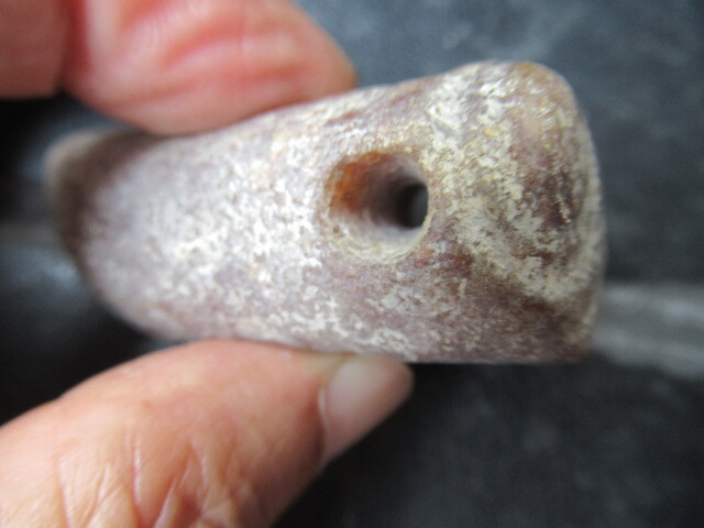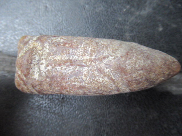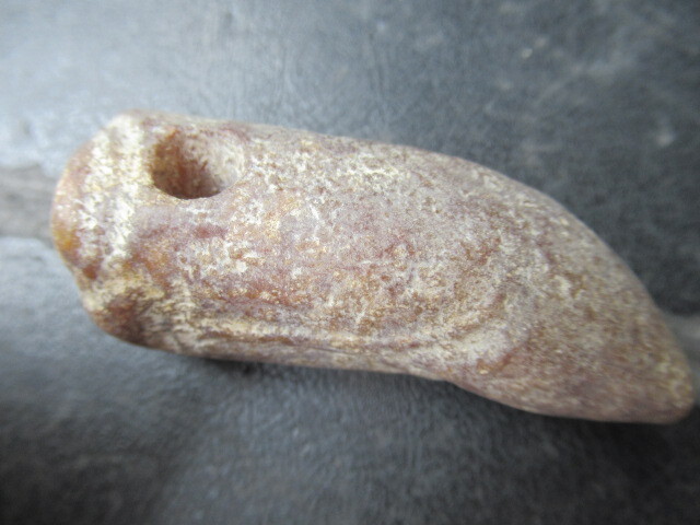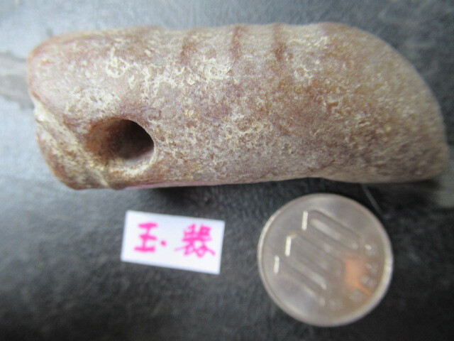 玉器未鑑定品。非崑崙系のネフライト玉製のセミ形玉器いわゆる玉蝉ですが作風と穿孔が古代的。イモムシふうの体躯と平面顔に両側から錐形の穿孔。サイズ顔面22/24mm、長さ60mm。送料無料。