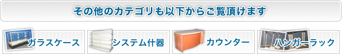 | ガラスケース・ジュエリーケース・コレクションケース など | システム什器・ゴンドラ什器 など | カウンター・レジ台 など | ハンガーラック・傾斜ハンガー・ハンガーストッカー など |