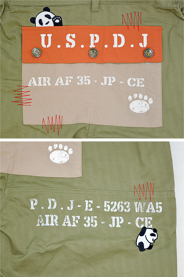 和柄ブランド【錦】の姉妹ブランドとして誕生した、お茶目なパンダをモチーフとした【PANDIESTA JAPAN】より「PDJ-ARMY 2WAYパンツ(554953)」のご紹介です。 今や、錦の定番モチーフとなった「錦PANDA」!! 今回は生地自体に表情のある綿100%のヘリンボーンツイル生地をベースに使い、ワイドシルエットで履き心地の良いミリタリーパンツが登場しました。 フロントポケットを深めに設定したベイカーパンツをオマージュしたデザインで、ゆる可愛いデザインのため、男女問わず幅広いスタイリングが可能になります。 ルーズになり過ぎなワイドシルエットで、穿き心地の良いミリタリーパンツをデザインしました。 また、ウエストのサイド部分はゴムリブ仕様のため、ストレスなく脱ぎ穿きが可能になります。 左足のカーゴポケットには戦闘中の止血用に配置されたロープを再現しており、前後三か所のパンディエスタは刺繍で仕上げています。 なお、ショートパンツでのご使用時には、ファスナースライダーは外した脚部側に付いているため、肌を傷つけることなく安心安全にお使いいただけます。 | |||||||||||||||||||||||||