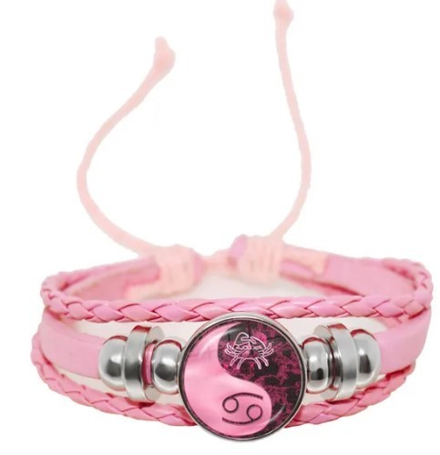 【かに座、ピンク】12 星座ブレスレット陰陽星座ガラスカボションピンクレザーブレスレット女性女の子誕生日ギフト