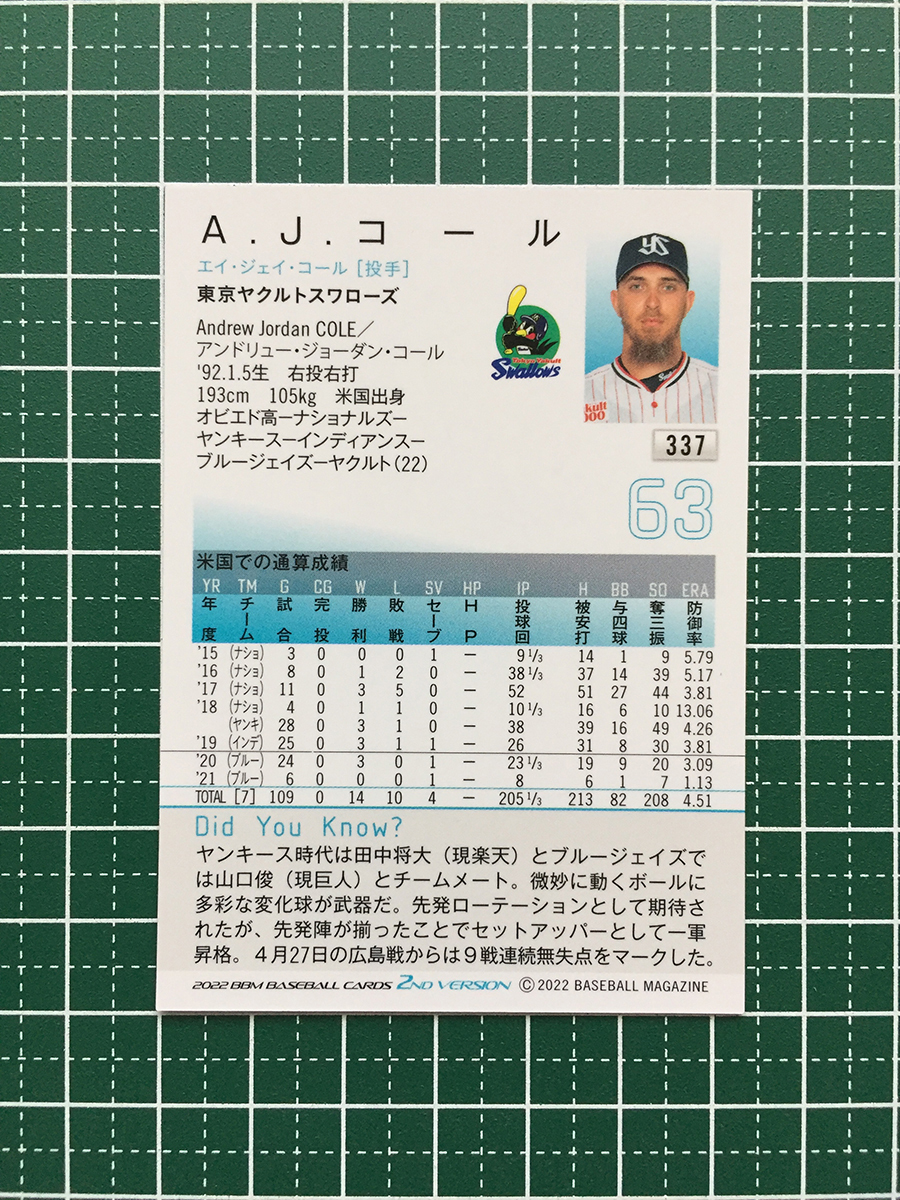 ★BBM 2022 プロ野球 2nd バージョン #337 A.J.コール[東京ヤクルトスワローズ]レギュラーカード「1stアップデート版」★