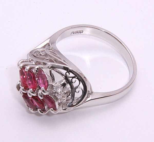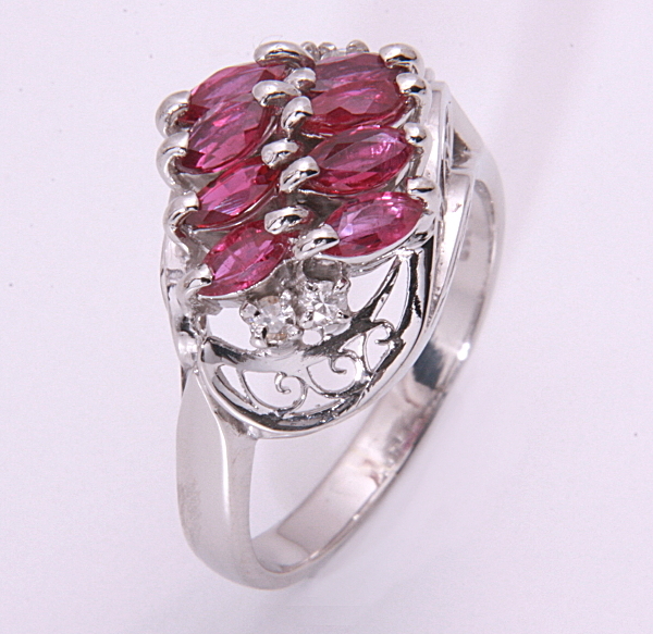マーキスカットのルビーが8石で合計1.02ct留められたデザインリングです。