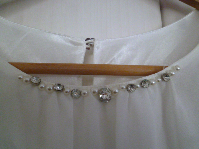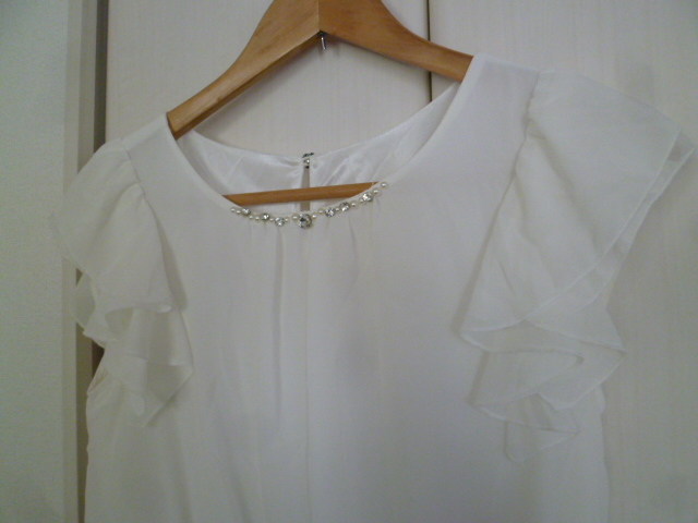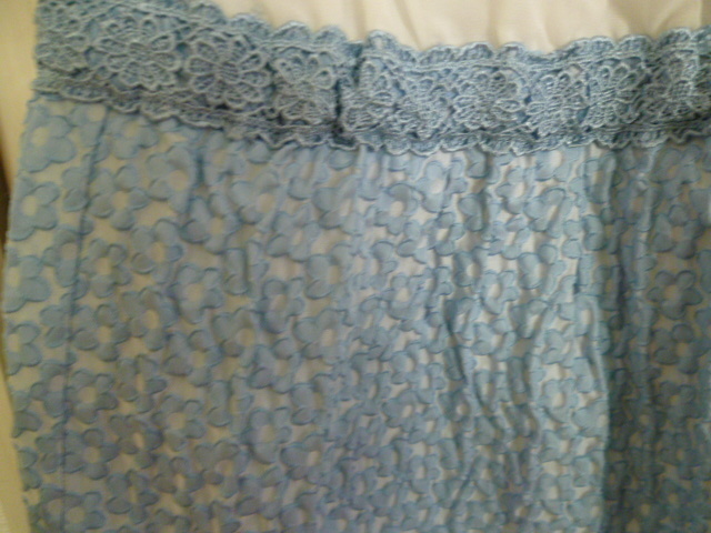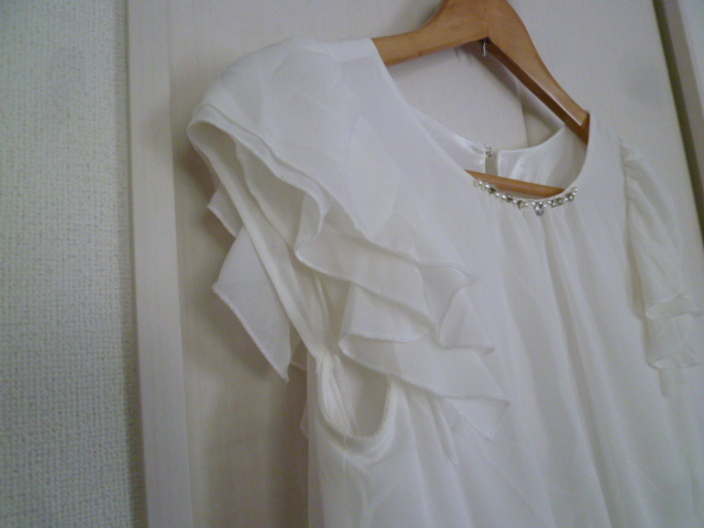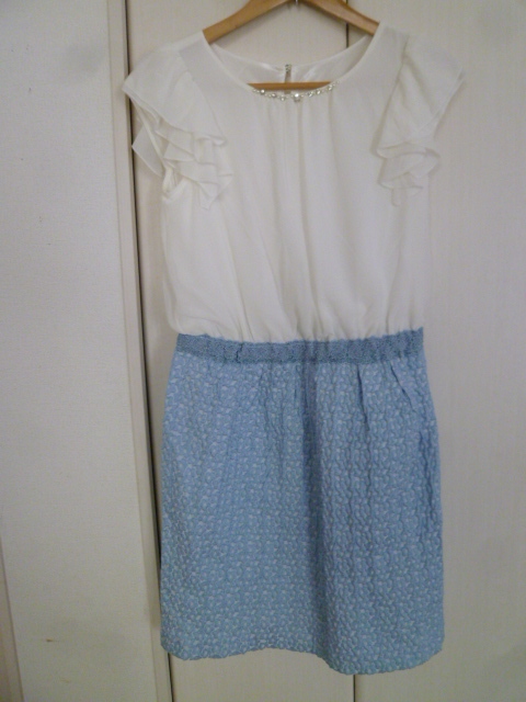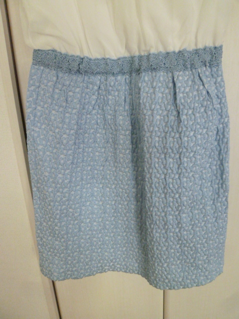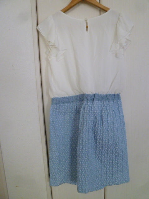 mimosa○白シフォンブラウス×水色デイジー柄スカート異素材ドッキングワンピース11AR/11号Lパールビジューフリルフォーマル結婚式○OP1118