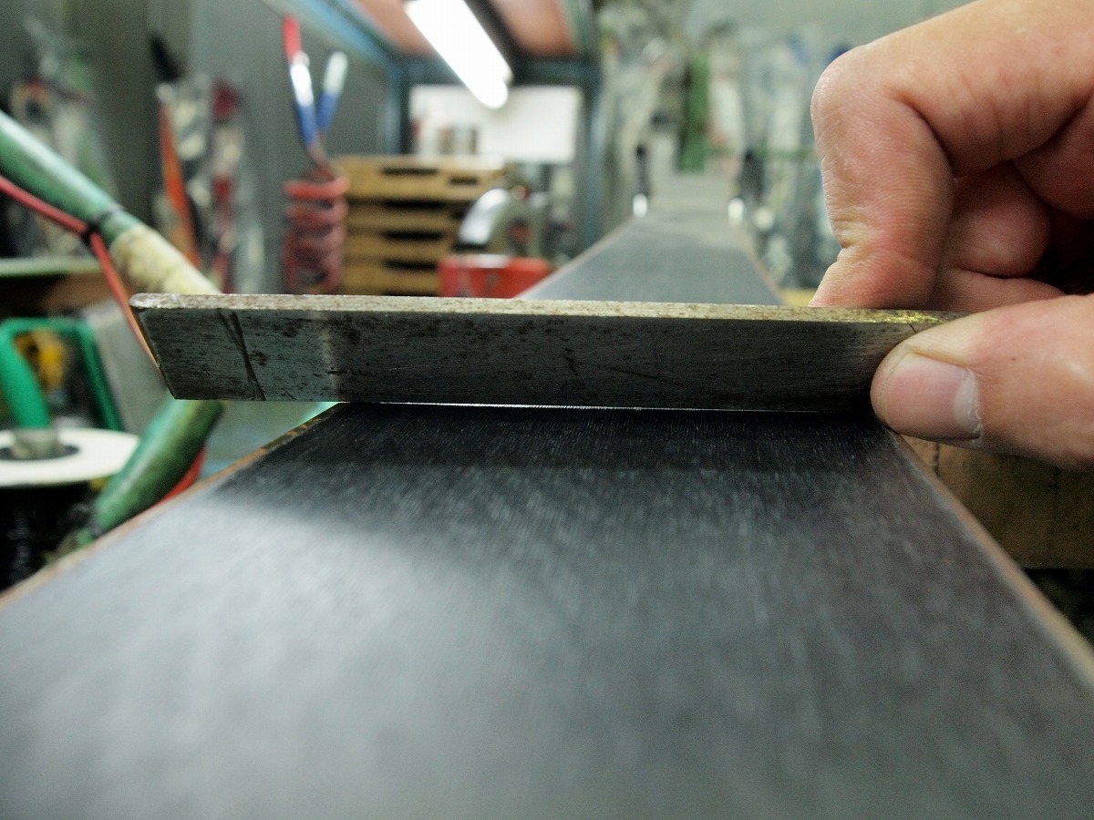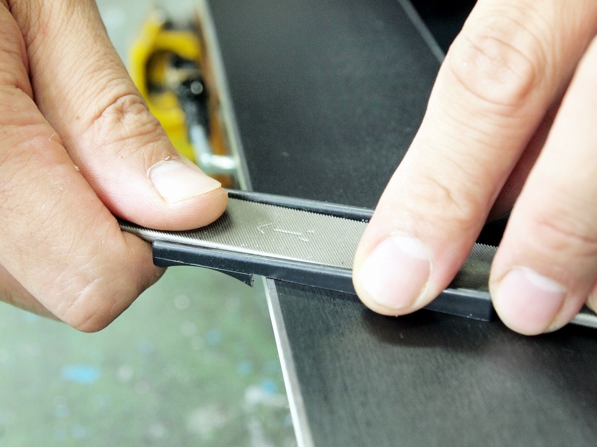 ●エッジに残ったバリを丁寧に取り除くとともにエッジの鋭調整を行います。当店はバフを使用せず、一台一台手作業でこの工程を行います。 これによってノーズからテールまで正確で均等なエッジの鋭調整が可能となります。エッジ防錆剤処理はこのタイミングで行います。 |