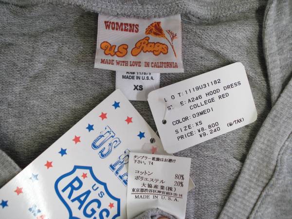 新品USA製*US Rags*カレッジパーカーワンピースXS定価\9240/108