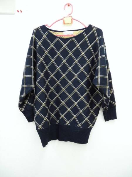 ①紺×斜め格子柄 七分袖ドルマンニット(Mサイズ)