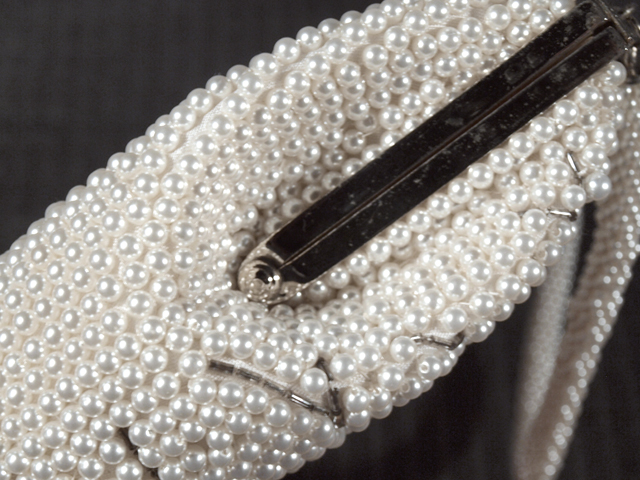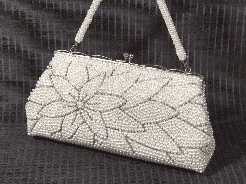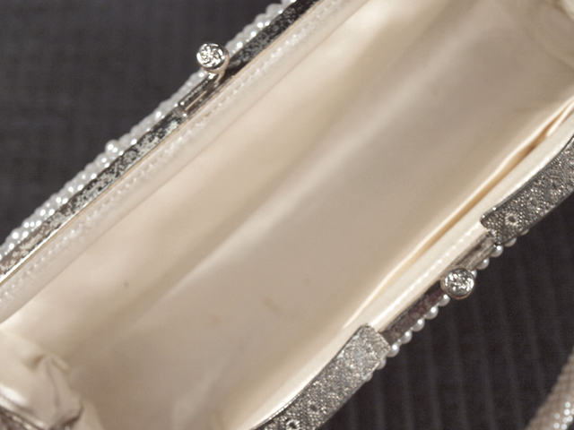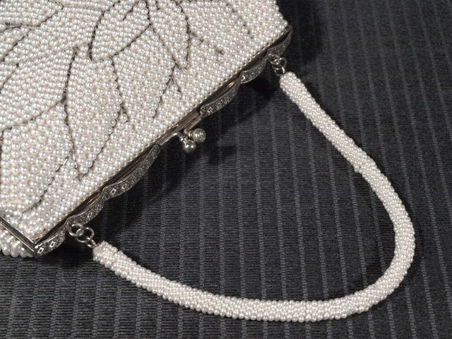 | 詳細 | 白色の地に花の文様があらわされているビーズバッグです。 大胆な花の文様がアンティークらしい雰囲気です。内部にポケットが 1 つあります。 画像のとおり、口金部に変色がの全体的にあるほか、持ち手にこまかなビーズのゆるみが若干あります。また、内部の裏地に直径約 1~2mm のよごれが数か所ありますが、そのほかに目につくしみやよごれ、褪色などのダメージはなく、きれいな状態です。アンティークにご理解のある方であれば、お使いいただけます。 |
