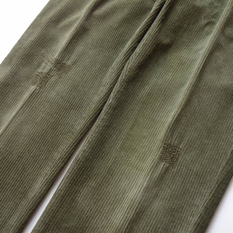 画像からも分かるように、ヴィンテージウォッシュによってアタリ感を出し、じっくり穿き込んだような味のある風合いが生み出されています。両膝および右腰付近に施された職人の手作業によるリペア加工(本体と同色のステッチ加工)も洒落ており、控えめながらも唯一無二の存在感を放っています。絶妙なさじ加減でアメカジテイストを取り入れたコーデュロイパンツですが、イタリアならではの上品さがしっかり残っており、大人らしさをキープできるところにインコテックスの真髄があります。そのままカジュアルに穿いてもイイですし、キレイめスタイルのハズシに使っても面白いと思います。