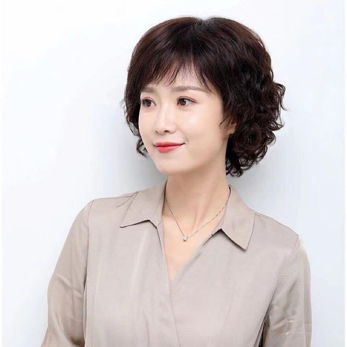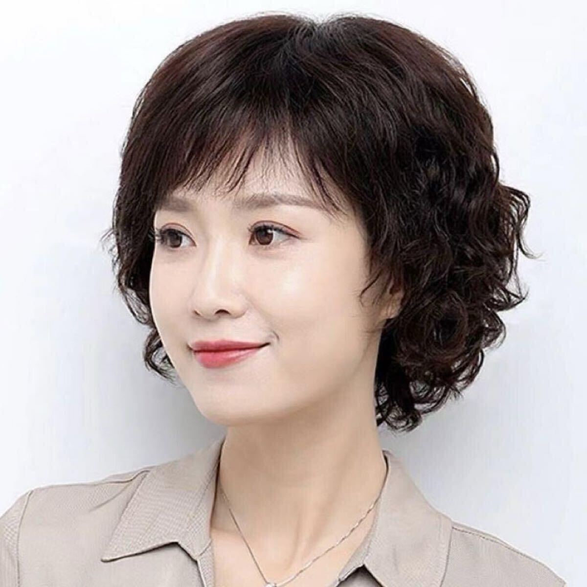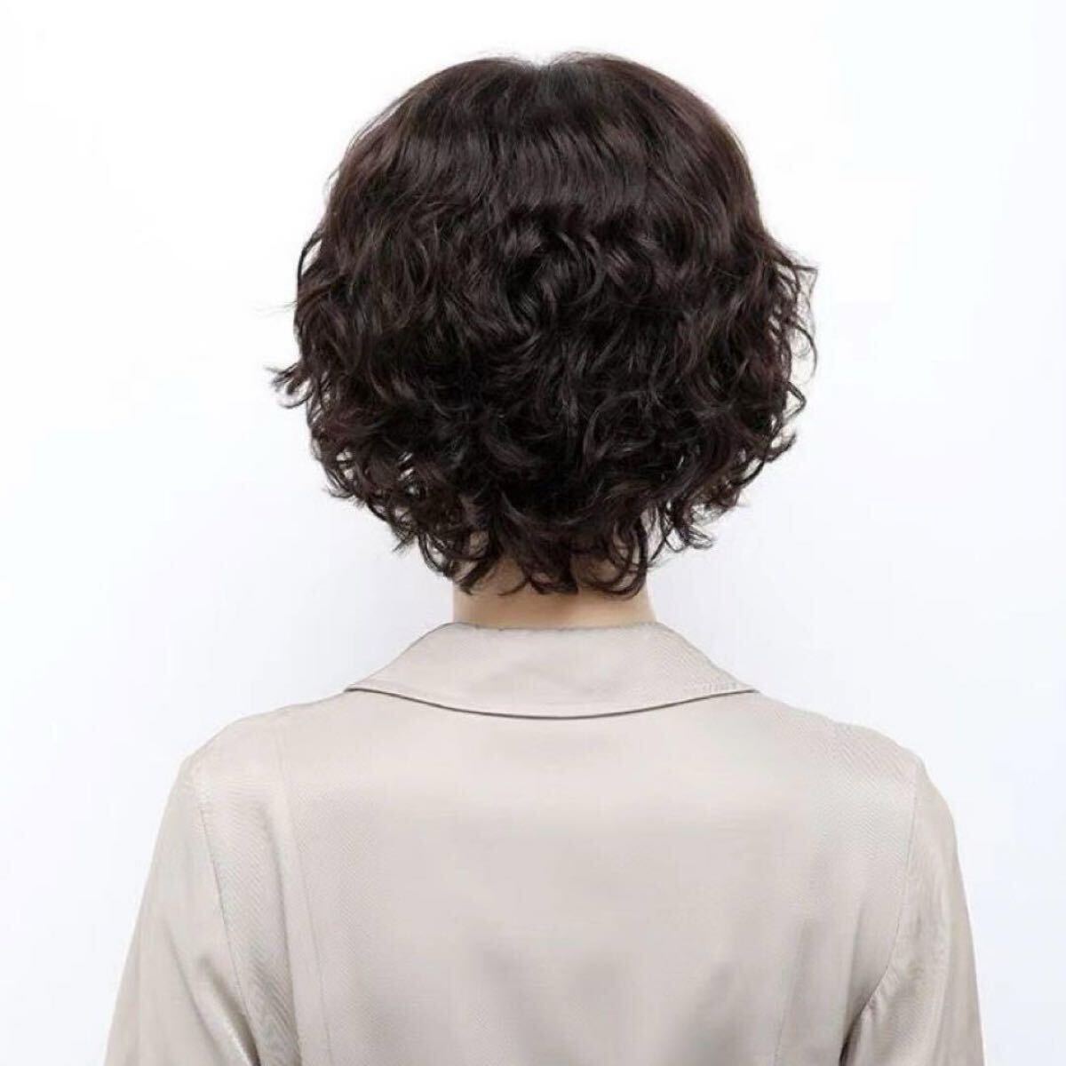 ナチュラルブラウンのショートパーマヘアーがおしゃれな中高年女性に最適のウイッグです。