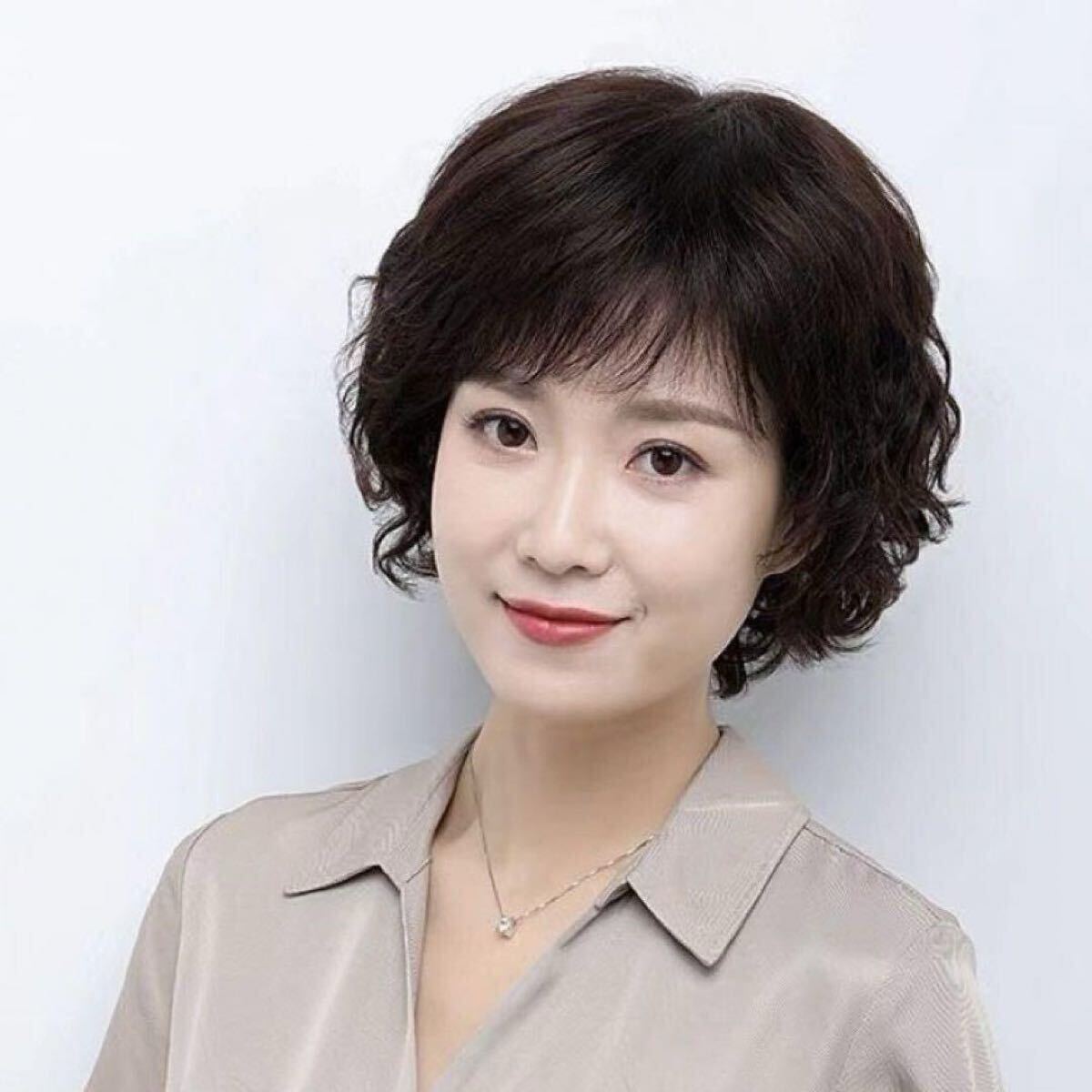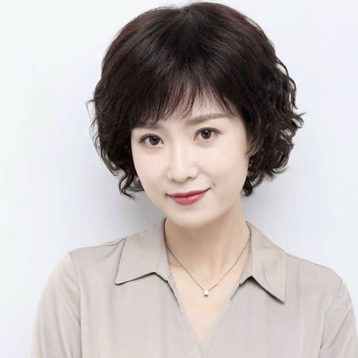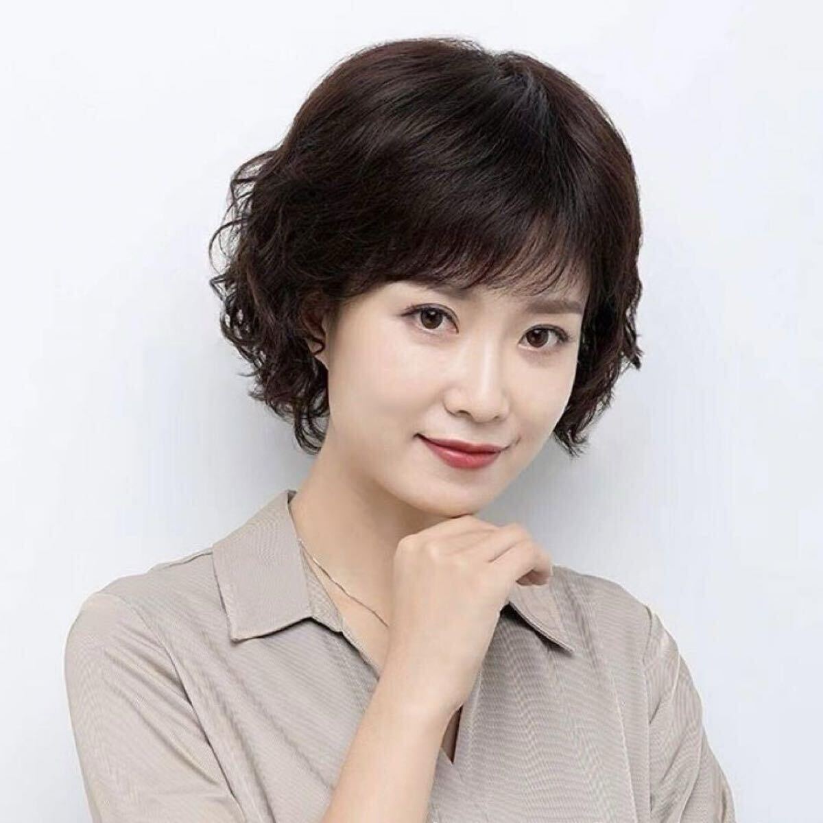 ナチュラルブラウンのショートパーマヘアーがおしゃれな中高年女性に最適のウイッグです。