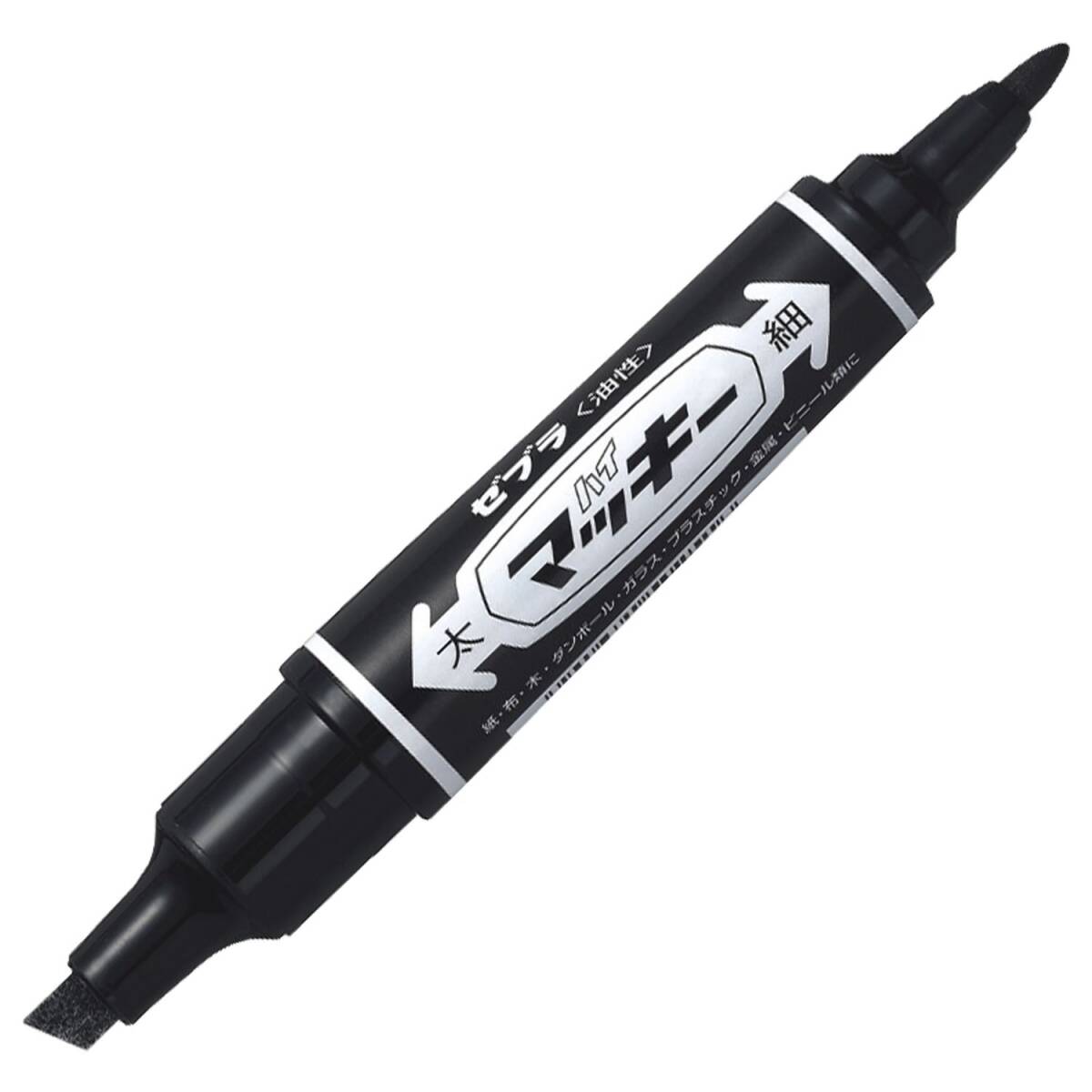 1本で太細両用が使える便利な油性マーカー。 速乾性・耐水性で、紙・布・木・ダンボール・ガラス・プラスチック・金属・ビニール類などに幅広く利用できる。(浮輪等の軟質塩化ビニール製品には適しません。)