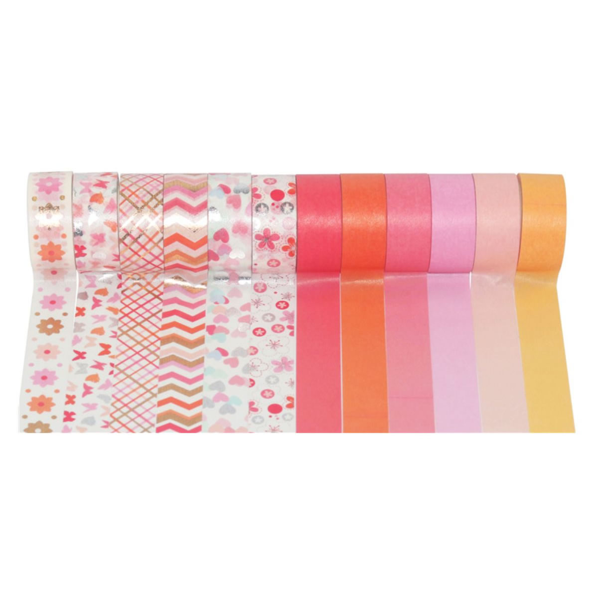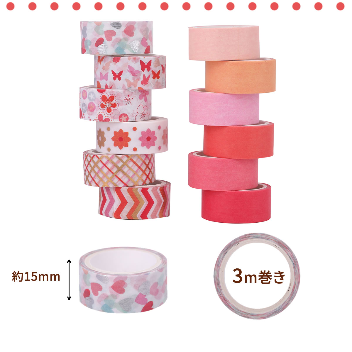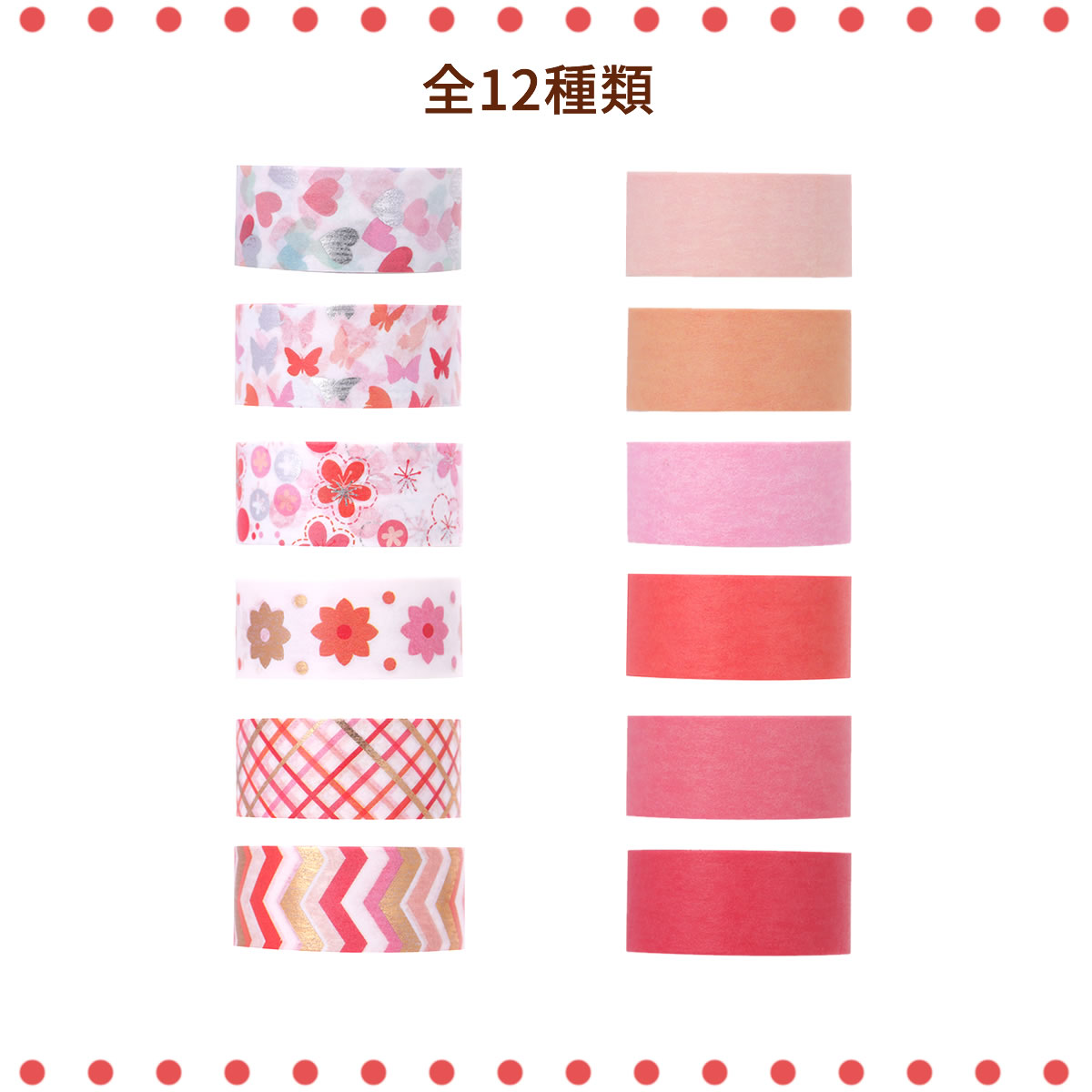 マスキングテープ 赤ピンク系柄&無地 12巻セット マステ 15mm×3m 花 蝶々 ハート 無地 金 銀 可愛い 手帳 ラッピング 送料無料 yp