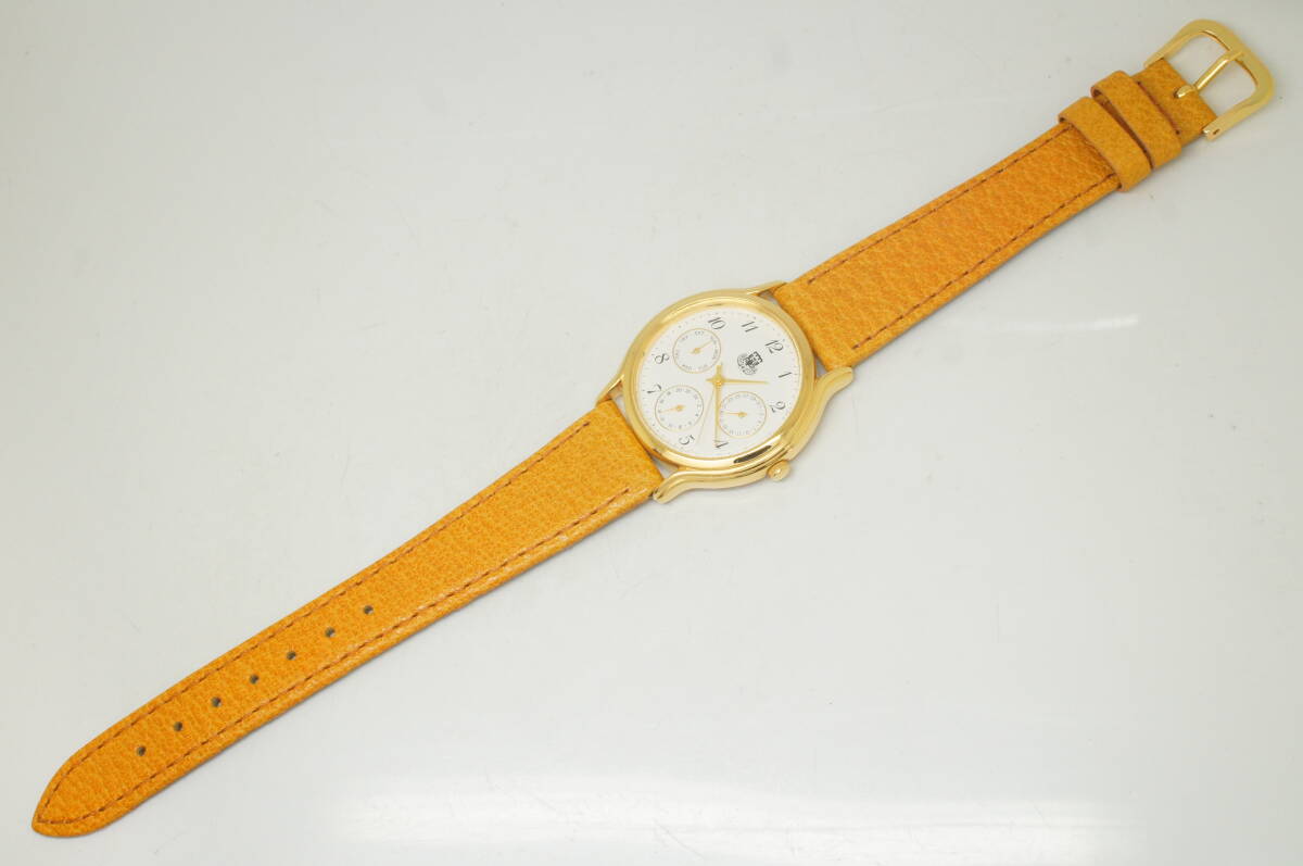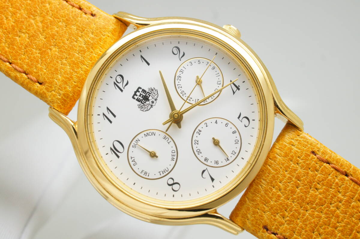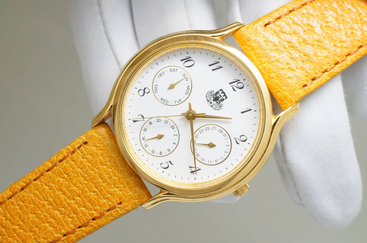 J199●作動良好 未使用ベルト 超美品 日本大学 白文字盤 デイデイト アラビア数字 メンズ腕時計 ゴールド金 クォーツ