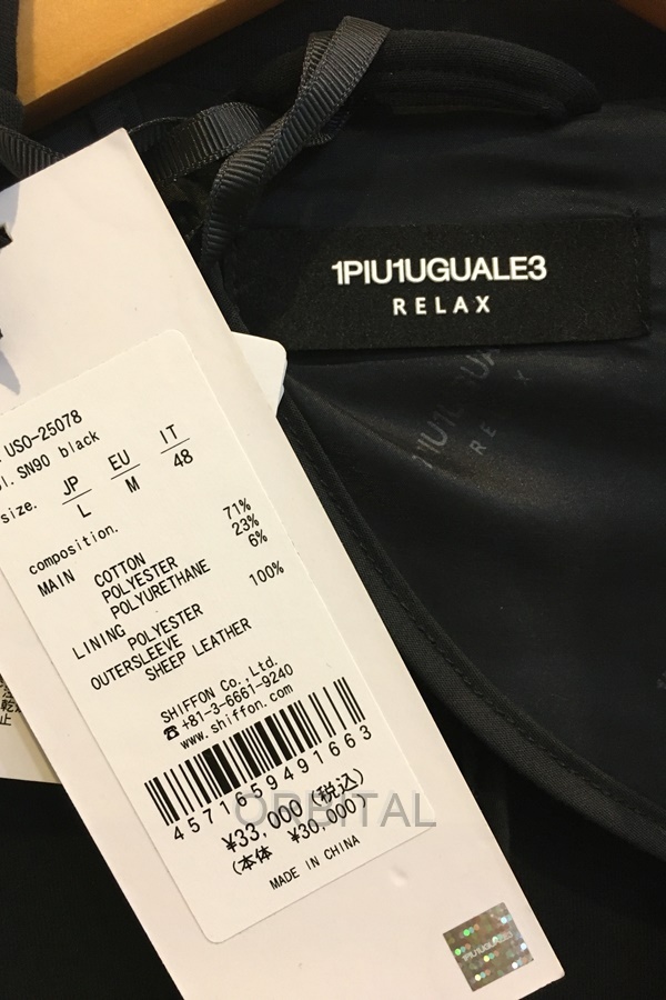 1PIU1UGUALE3 RELAX ウノピゥウノウグァーレトレ レザースリーブノーカラージャケット 定価33,000円 メンズ L ※袖スレ
