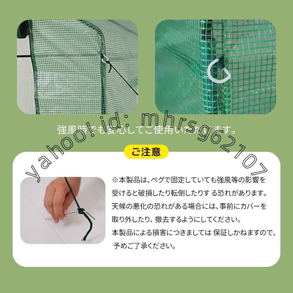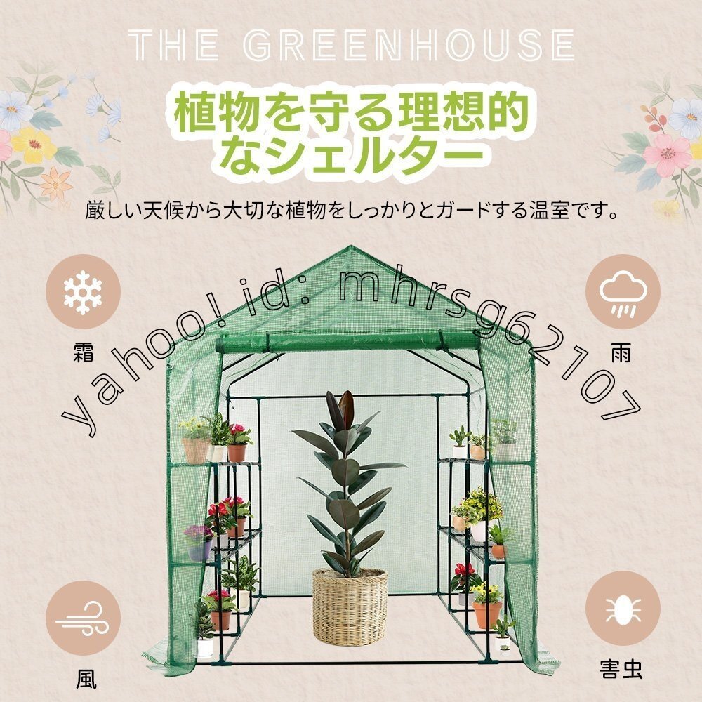 • ◎02 【四季を通じて使える魅力】冬寒さから植物を守り、越冬を助けるための快適な環境を提供します。霜や低温の影響を受けやすい温暖地域原産の植物も、安心して育てられます。""夏直射日光を和らげ、葉焼けを防ぐための対策が取れます。遮光シートを利用すれば、特に日差しに弱い植物にも安心。また、突発的な豪雨からも植物を守ることができ、ガーデニングを存分に楽しめます。光合成を促進する設計温室は日中、しっかりと太陽光を取り込み、光合成を促進します。紫外線を軽減し、植物をしっかりと保護するための工夫が施されています。温度管理と防水性PVC生地は日中の熱を保持し、夜間も内部の温度を安定させます。外気温の低下による冷え込みや霜の発生を防ぎ、植物を安全に守る機能を持っています。