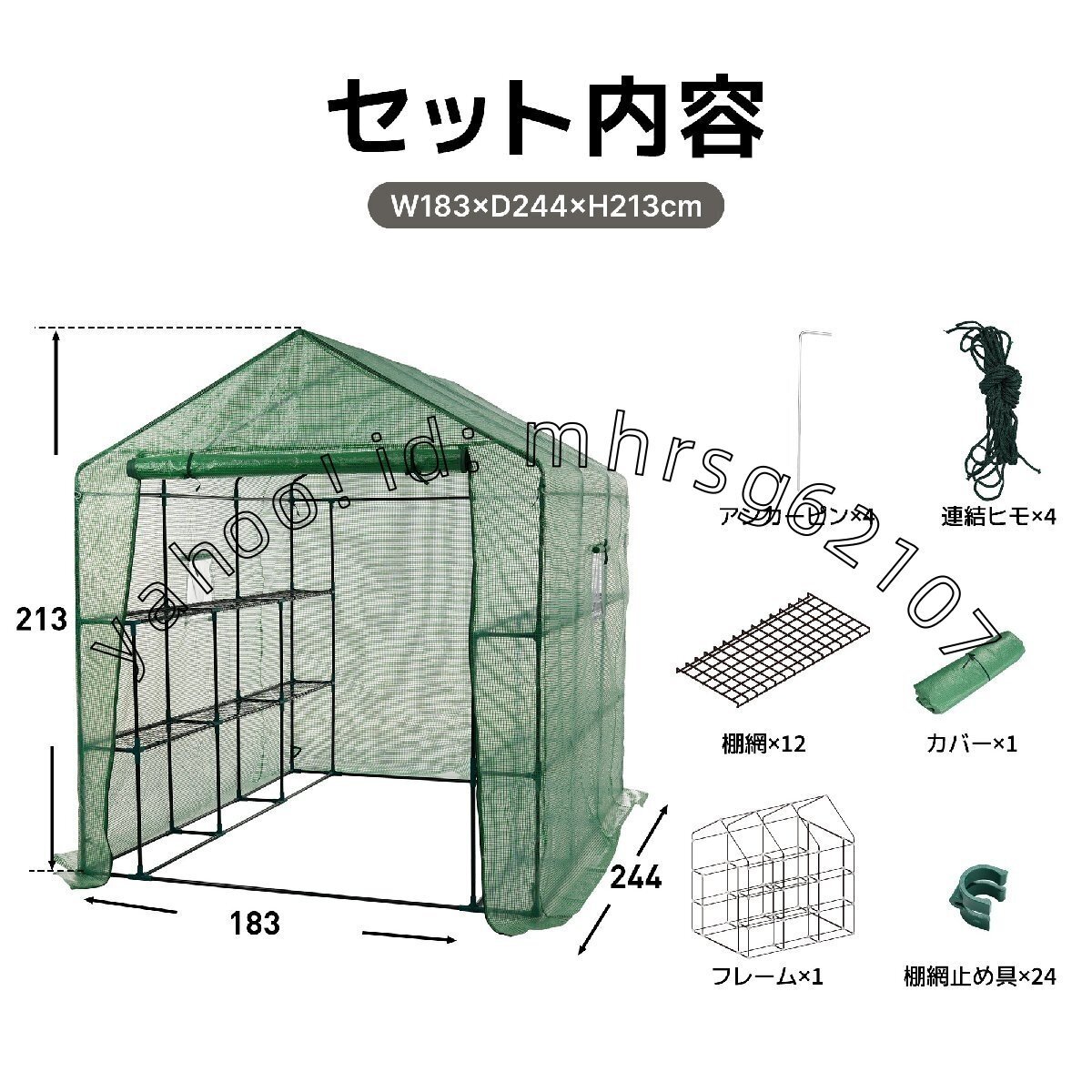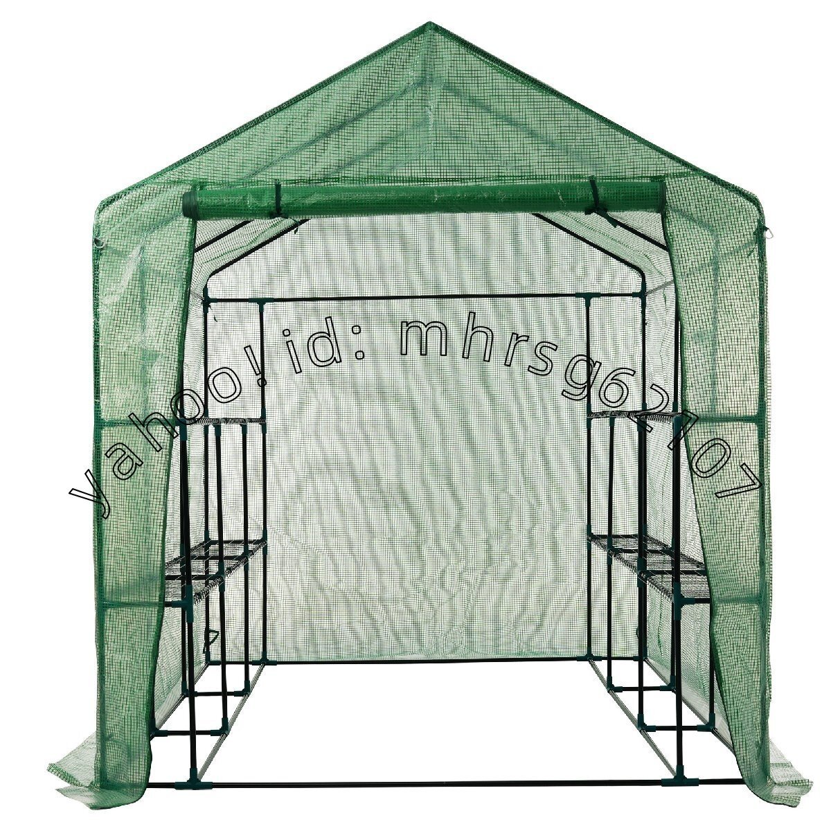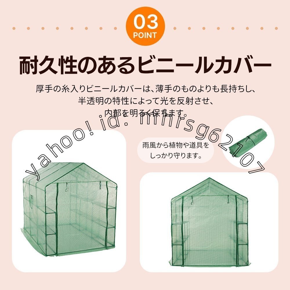 • ◎03【余裕のある入室スペース】人が入れる大容量温室です。3列の仕切りは空間を活用し、より多くの植物や盆栽を置くことができます。耐久性のあるビニールカバー厚手の糸入りビニールカバーは、薄手のものよりも長持ちし、半透明の特性によって光を反射させ、内部を明るく保ちます。雨風から植物や道具をしっかり守ります。