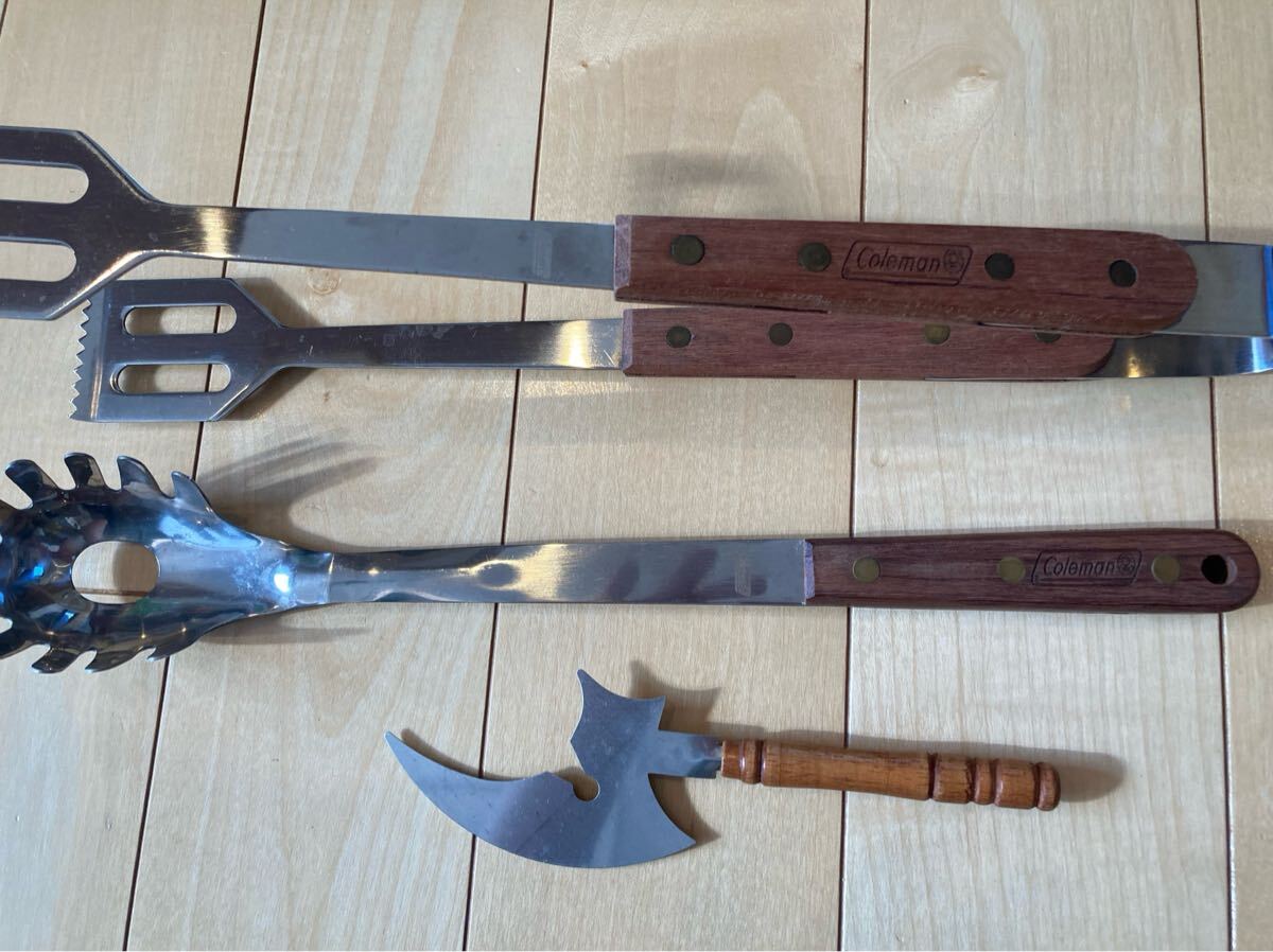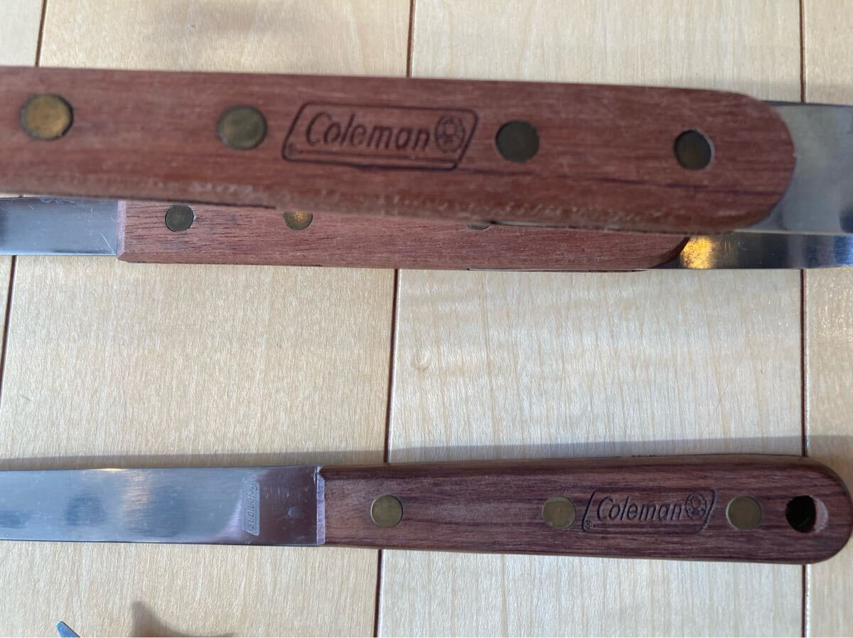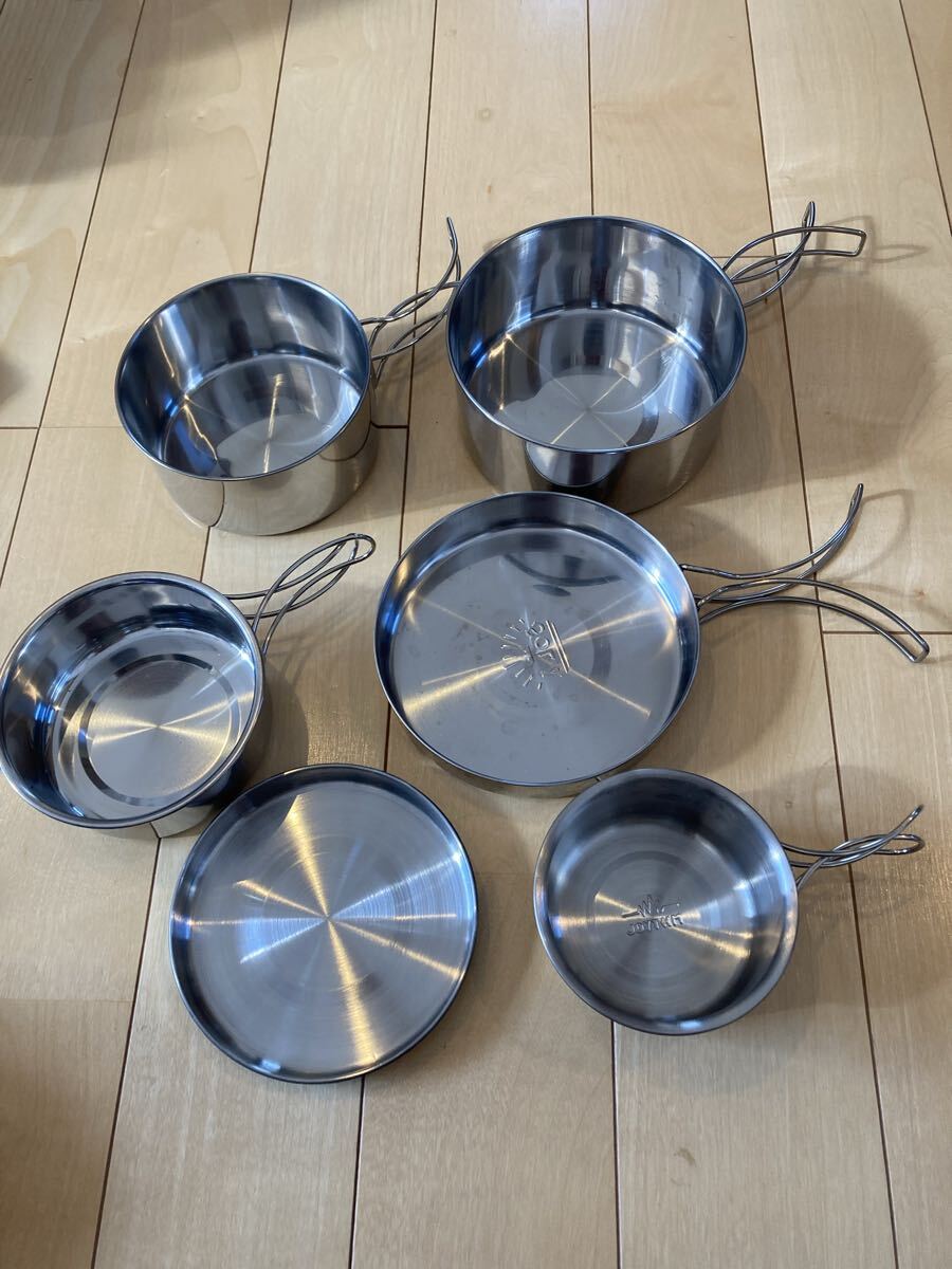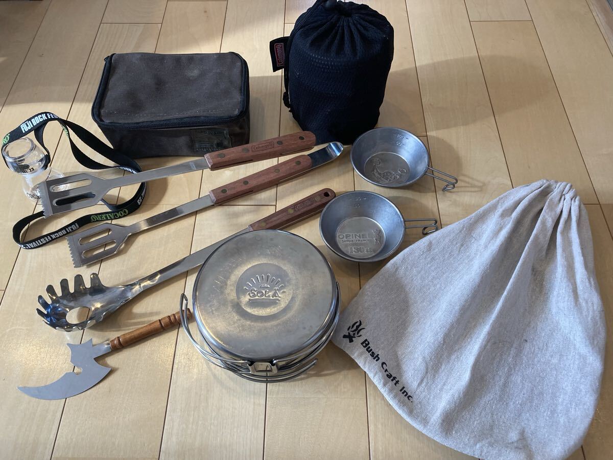 コールマン クッカーは1回 火にかけて使用しました。ブッシュクラフトの焚き火フライパンは5回ほど使用しております。その他の物は未使用のまま保管しておりました。 写真のものがすべてです セットでの出品です よろしくお願いいたします。