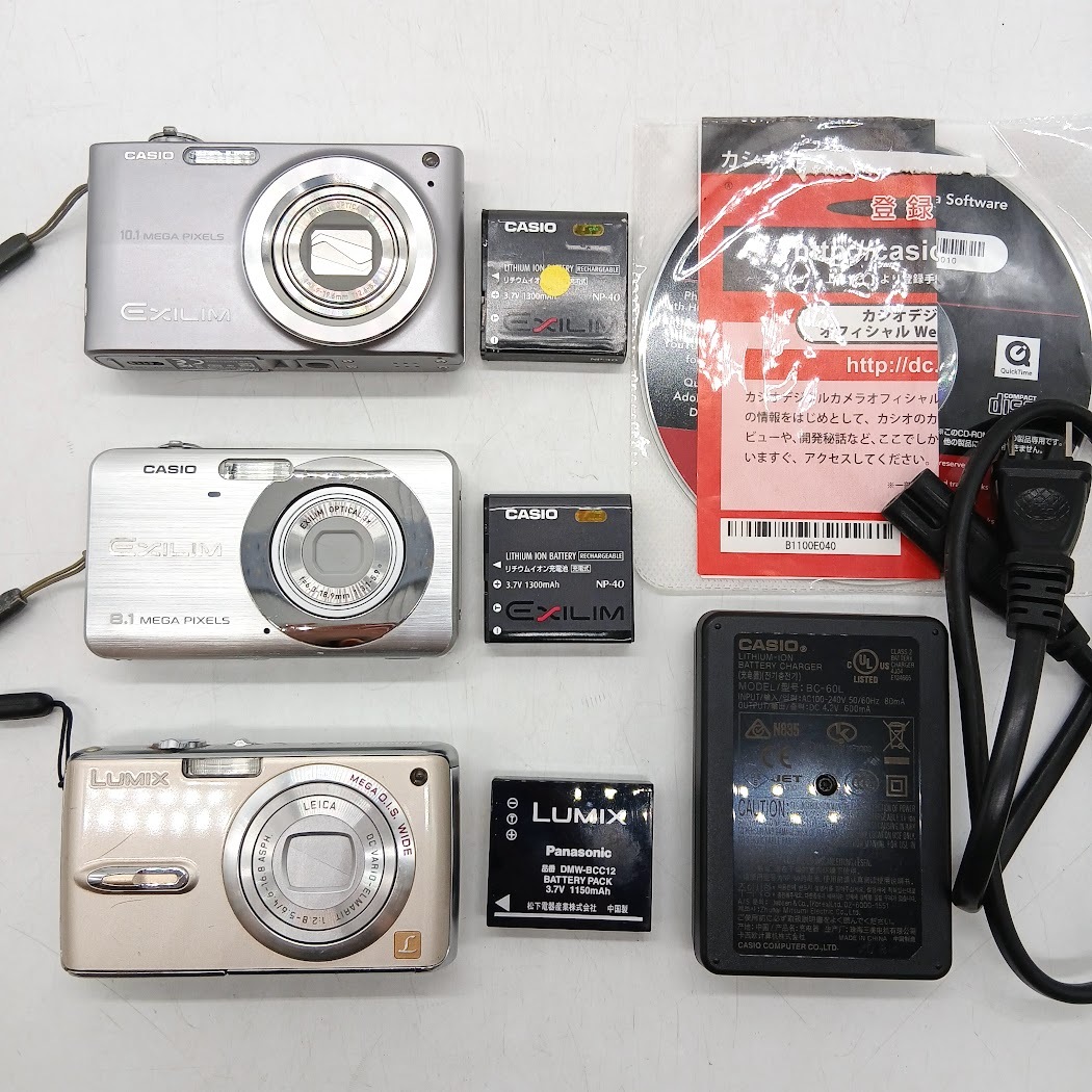 【S-4】通電確認済 デジカメ3台おまとめ Panasonic パナソニック LUMIX ルミックス CASIO カシオ EXLIM エクシリム バッテリー 充電器 CD-ROM ストラップ付 現状品 | |||