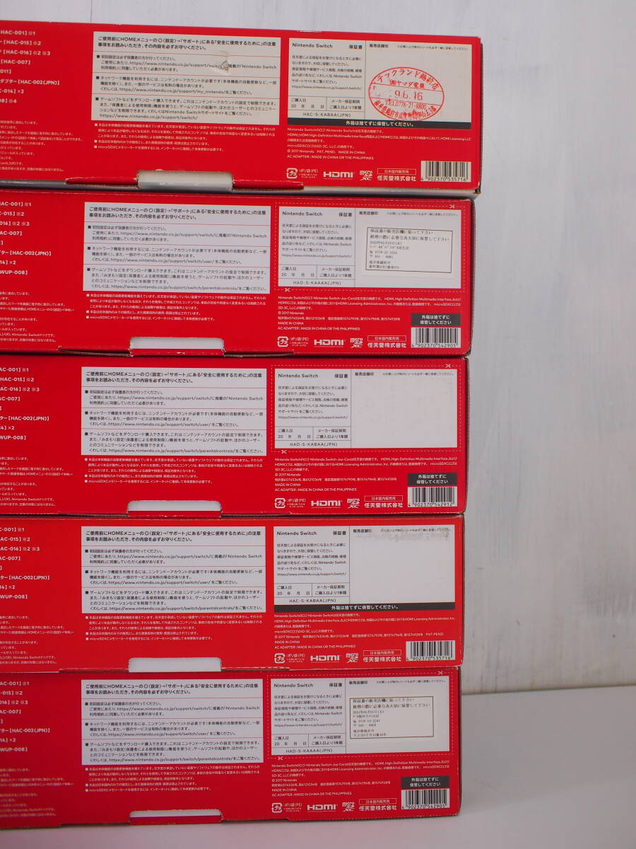 【 商品名 】 NINTENDO Switch 旧型含む5台 【 コンディション 】 中古品です。 正常に動作します。 Ver.20.5.0が2台、Ver.2.4.0が2台、Ver.2.1.5が1台です。 本体及び付属品にキズ、スレ、汚れがあります。 箱にイタミ、汚れがあります。 画面にスレがみられる、画面の左側にくすみあり、Joy-Con(L)欠品、Joy-Conに すり減りがみられる、Joy-Conのスティックにイタミあり、Joy-Conが代用品、 ケーブルにヨレがみられるものがあります。 画像のものが全てです。 現状品のお渡しとなりますので、付属品の欠品等ありましても対応致しかねます。 以上の状態をご理解の上でご入札をお願い致します。 【 発送について 】 ヤマト運輸の運賃元払いのみの取扱いとなります。 ※その他の発送方法には対応できません。落札後に指定されても対応致しかねます。 手渡し、引取などにも対応致しかねます。ご承知の上でご参加下さい。