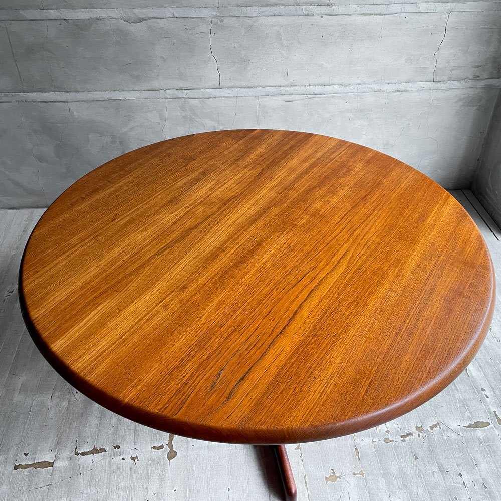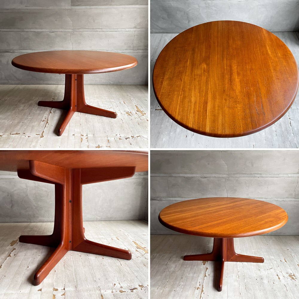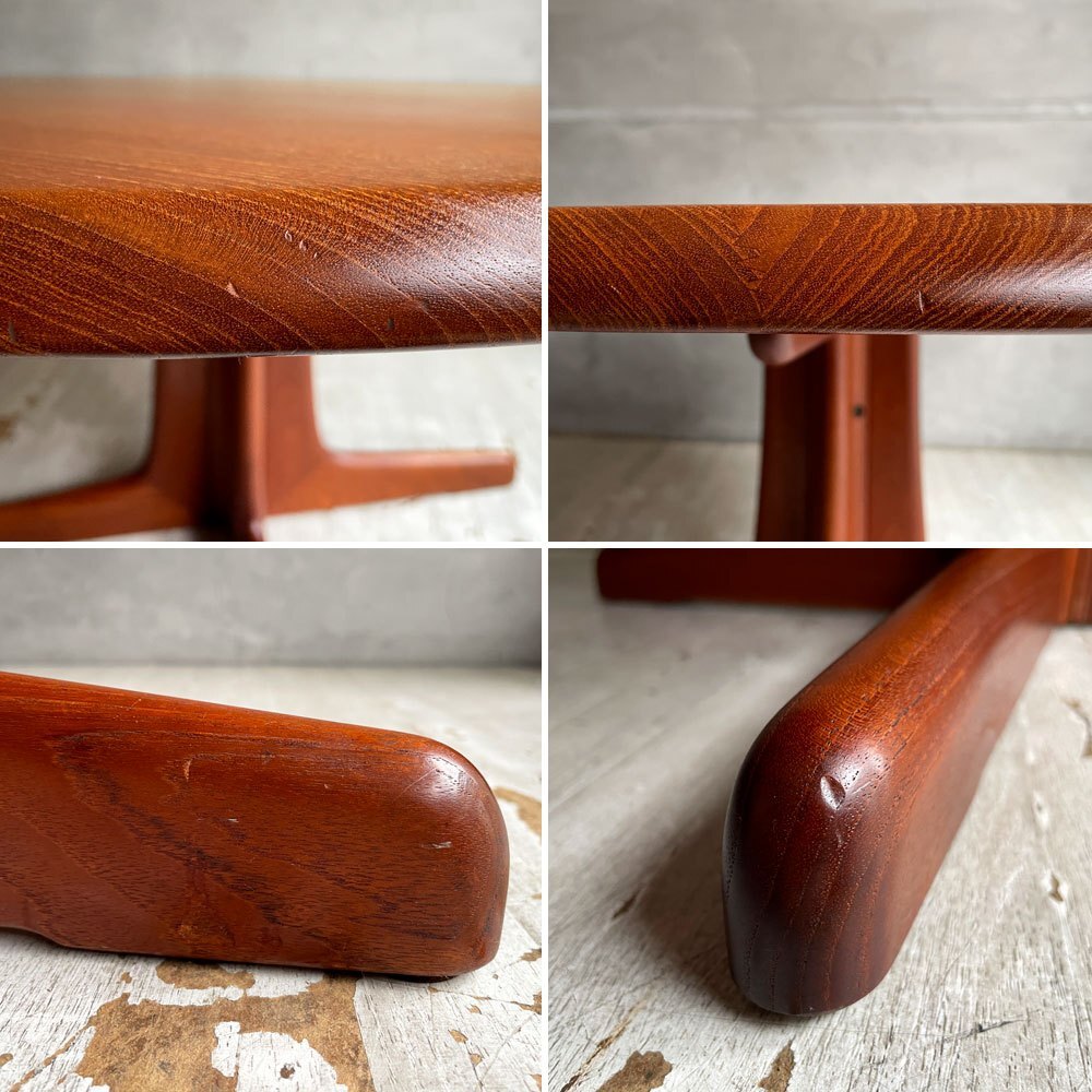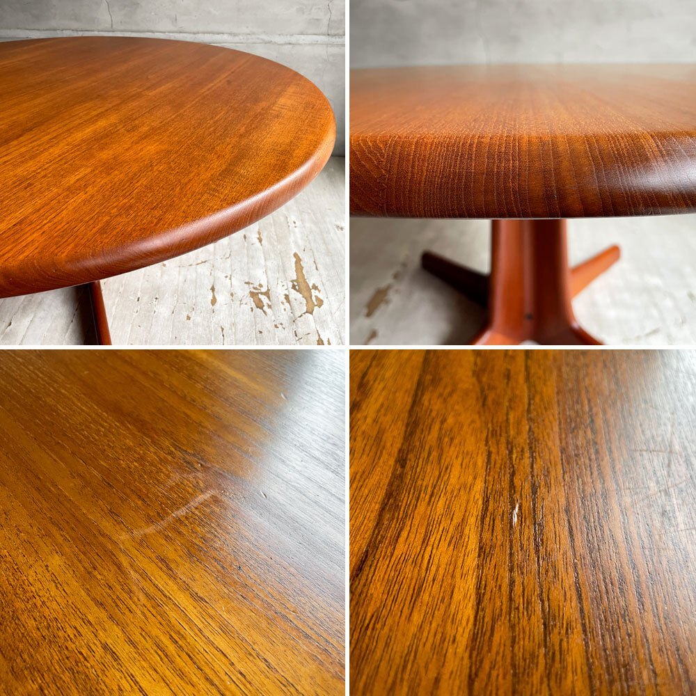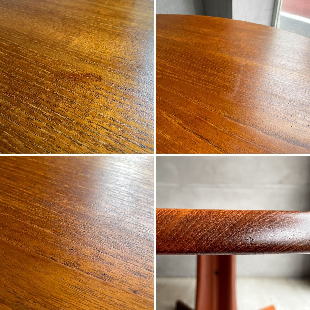 | コメント | どっしりとしたラウンド天板が特徴的なラウンドカフェテーブルが入荷致しました。 材にはチーク無垢材を贅沢に使用し、チークならではの美しい杢目を楽しむ事が出来ます。経年変化による赤味を帯びた深い色合いは他のビンテージ家具との相性も抜群で、北欧スタイルやクラシックな雰囲気にピッタリなアイテム。 滑らかに仕上げられた天板はチーク材の心地よい肌触りが感じられ、ついつい撫でてしまうような肌触り。 110Φのラウンド天板は厚さ約3cmと肉厚で、どっりした印象ながらも角が取られたラウンド型のおかげで優しい雰囲気に。 高さ約55cmとカフェテーブルとローテーブルの中間の様な高さ。こちらは椅子やソファに座りながら軽い食事やお茶、作業を行うのにピッタリなサイズ感です。 脚部は中心にある為、横幅の広い椅子でも挿し込む事が可能なので椅子のレイアウトの幅が広がります。 独特のサイズ感によりカフェ、ローテーブルを融合したような使い心地を体験出来るこちら。 リビングやダイニングなどソファや椅子がある所だけでなく、さらにリラックス空間を延長してくれるような一台です。 ※当ショップは、主にリサイクル品を取り扱っております。基本的にUSED品である事をご理解頂き、ご入札をご検討下さいませ。 |