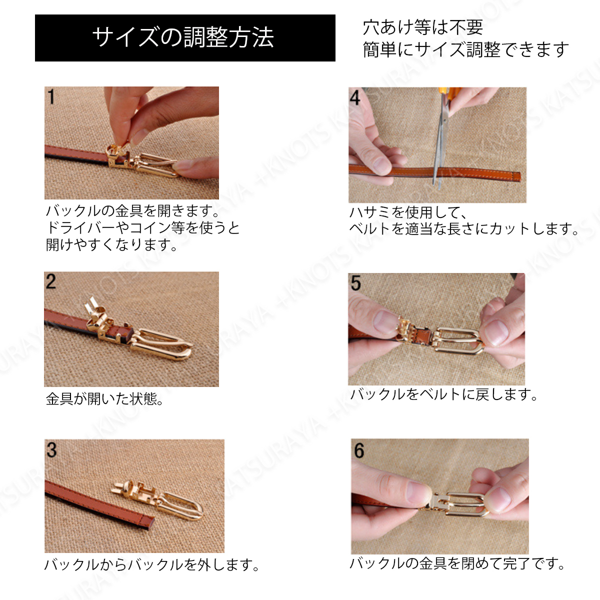 すっきりスマート帯幅1.1cm、本革のしっかりした細ベルトをお探しの方におすすめです。柔らかすぎず硬すぎない滑らかな本革を使用。ワンピースのアクセントに、パンツやスカートに、オフィスカジュアルにもおすすめです。バックルの取り外しが容易で穴あけ不要の簡単長さ調整、ハサミで切断しお好みの長さに調整できます。