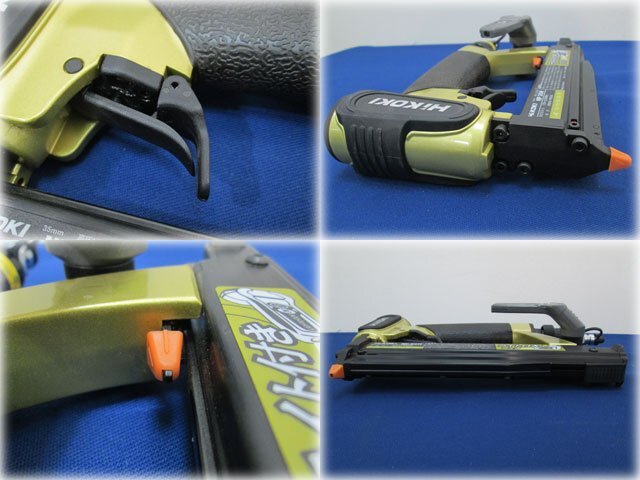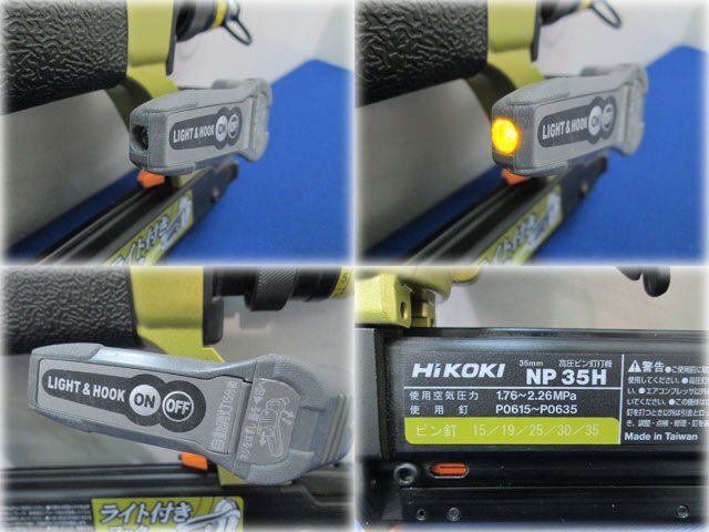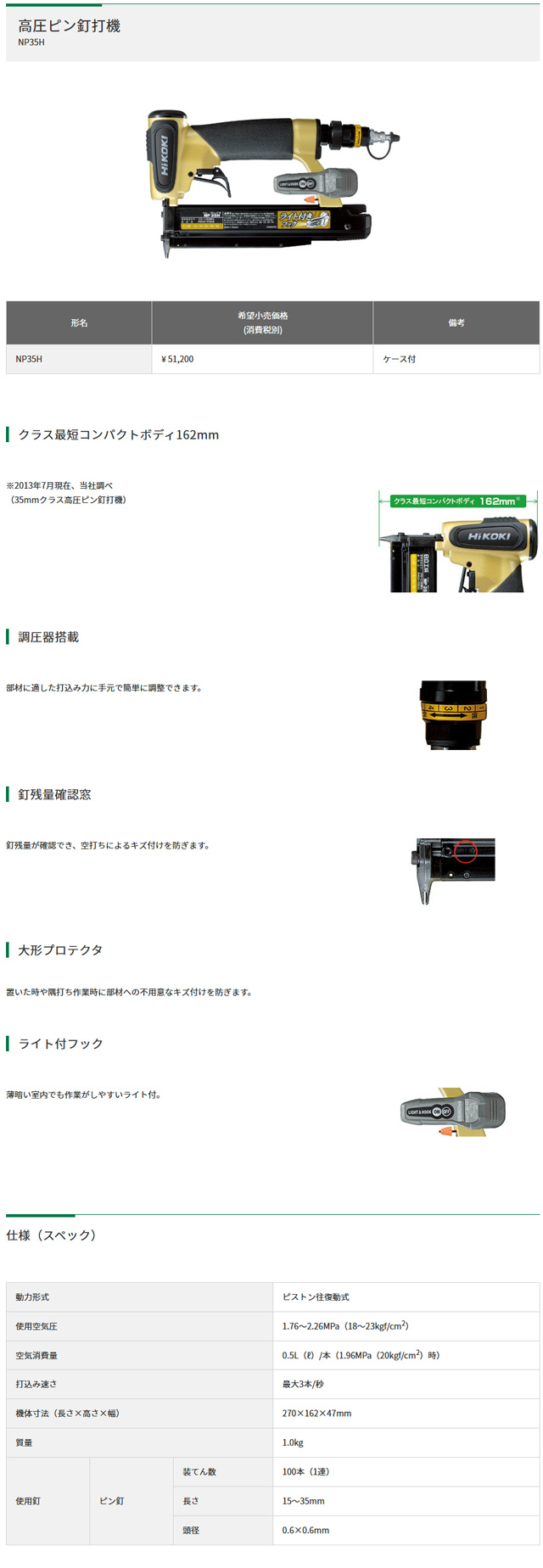 HiKOKI 35mm高圧エアピン釘打機 NP35H を出品いたします。 ■特徴■ クラス最短コンパクトボディ162mm ※2013年7月現在、当社調べ (35mmクラス高圧ピン釘打機) 調圧器搭載 部材に適した打込み力に 手元で簡単に調整できます。 釘残量確認窓 釘残量が確認でき、 空打ちによるキズ付けを防ぎます。 大形プロテクタ 置いた時や隅打ち作業時に 部材への不用意なキズ付けを防ぎます。 ライト付フック 薄暗い室内でも作業がしやすいライト付。 ■仕様■