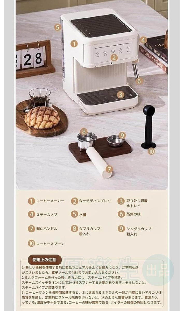 エスプレッソマシン 家庭用 コーヒーメーカー ミルク泡立て器 20bar圧力 カップ加熱機能 ミルクフォーム/ラテアート/スチーム 1800mlyhw108