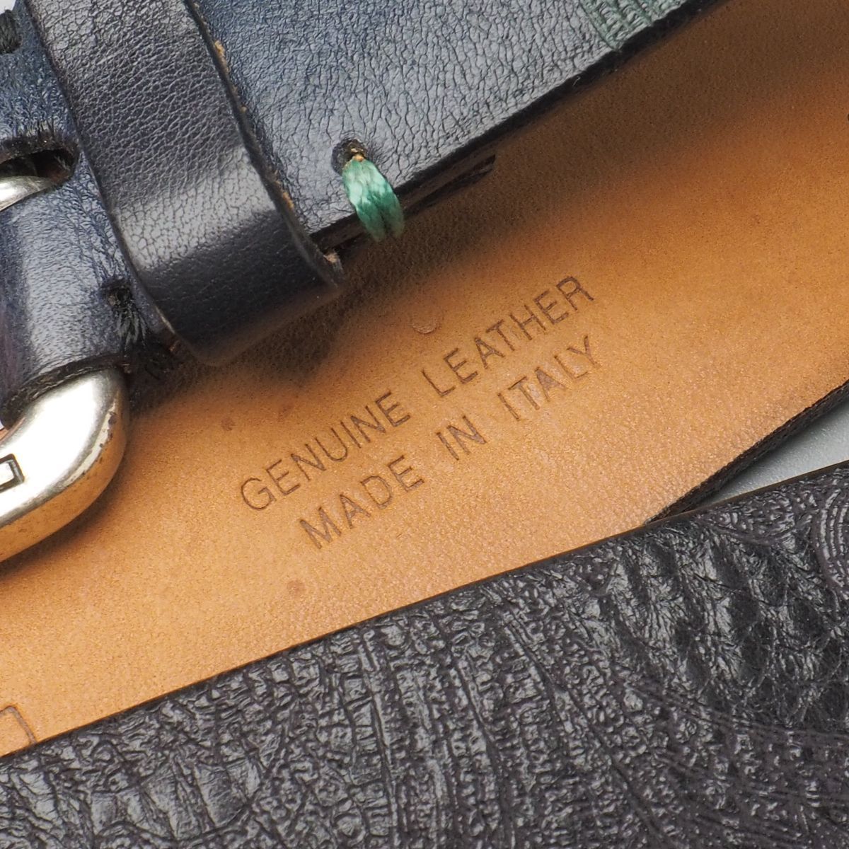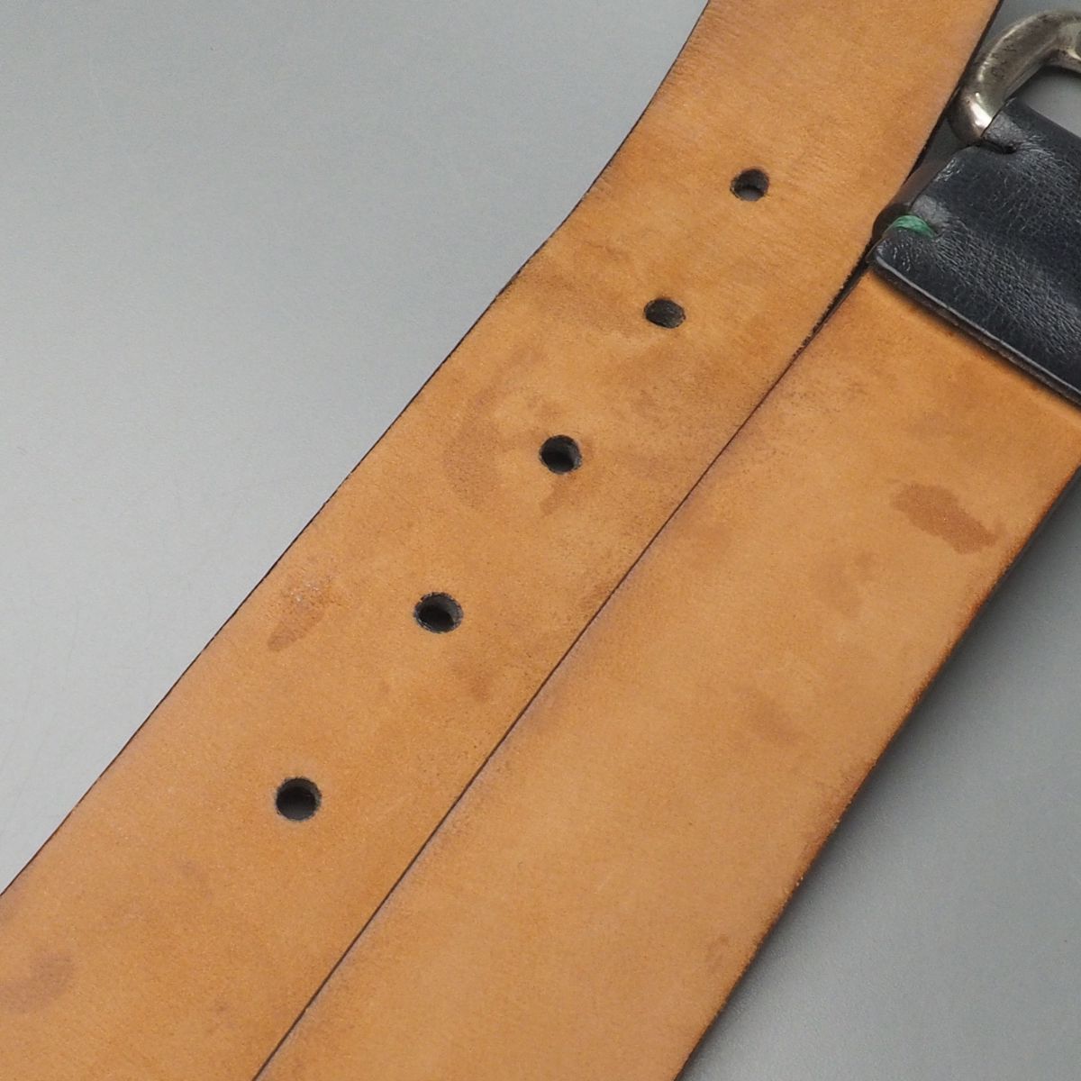 【コンディション詳細】 レザーの地色はネイビーと見られますが、経年や使用に伴い全体的にブラックがかった色味となっております。 ほかシワや歪み、薄い擦れキズ、バックル付け根のステッチのひとつが直されており、また裏面のシミや汚れなど見られますが、その他支障になるようなダメージ等はなくこれからも十分にご愛用いただけるコンディションです。 |