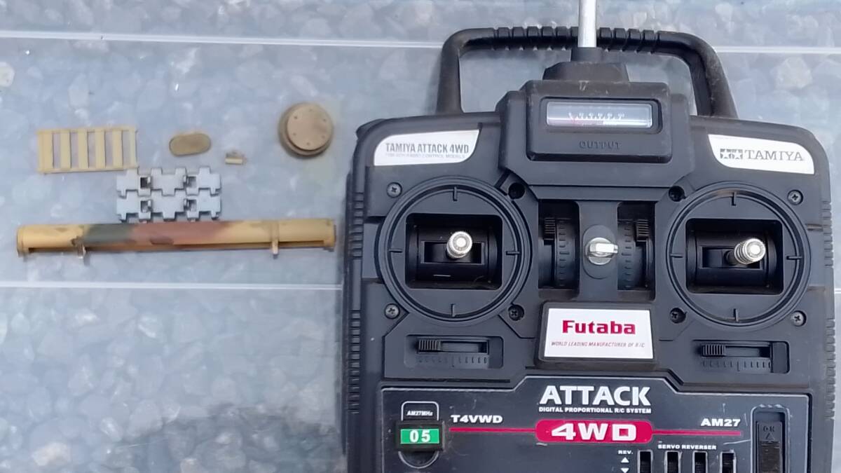 同時に複数のタミヤRCタンクを買い取りまして、送信機と車両がゴッチャになってしまいましたので、送信機は本車両用のものではありません。送信機のクリスタルは交換が必要かもしれません。