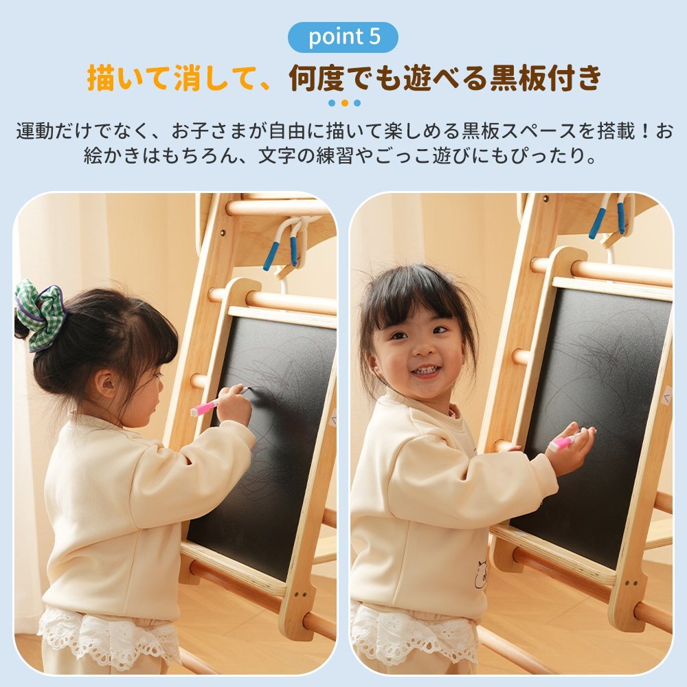 • ◎03 すべり台&クライミングの両用デザイン 正面はすべり台、裏面はクライミングホールド付きの2WAY仕様。1枚で「すべる」と「登る」の両方が楽しめるので、遊びの幅がぐんと広がります。すべり台の長さはたっぷり91cmお子さまがしっかり滑れて、満足感のあるサイズ感。両サイドには約3cmの縁を設置滑り落ちをしっかり防止。全身を使って遊べるクライミングウォールお子さまが登ったり、ぶら下がったり、手足をフルに使って遊べます。しっかりした構造と天然木素材で安全&安心見た目もおしゃれで、インテリアにもなじみます。クライミングウォールを登った先には、渡り板があり、座ったり景色を眺めたり、小さな“達成感”を感じられるスペースに。接続部は丸み加工&しっかり噛み合う設計で安全性も抜群!底部にはクッションマット付きで、小さなお子さまも安心して遊べます。