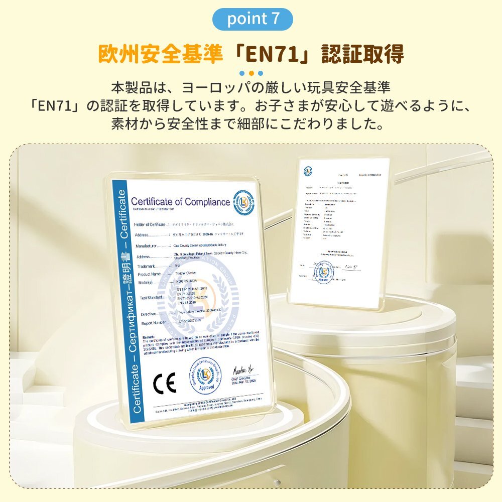 • ◎08欧州安全基準「EN71」認証取得本製品は、ヨーロッパの厳しい玩具安全基準「EN71」の認証を取得しています。お子さまが安心して遊べるように、素材から安全性まで細部にこだわりました。