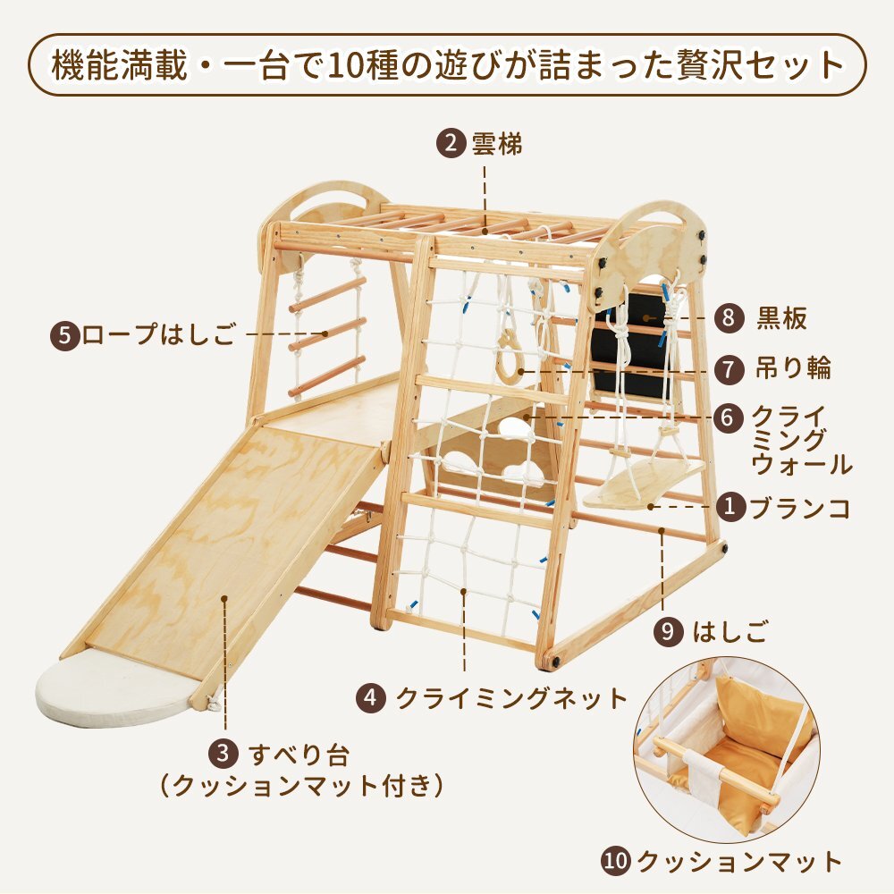 • ◎01おうちで思いっきり遊べる対象年齢/2歳から 80kgまで 機能満載・一台で10種の遊びが詰まった贅沢セット"①ブラコン ②雲梯③すべり台(クッションマット付き)④クライミングネット⑤ロープはしご⑥クライミングウォール⑦吊り輪⑧黒板⑨はしご⑩ハンモック
