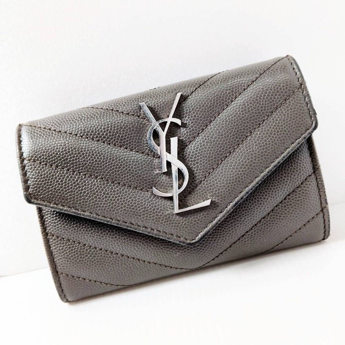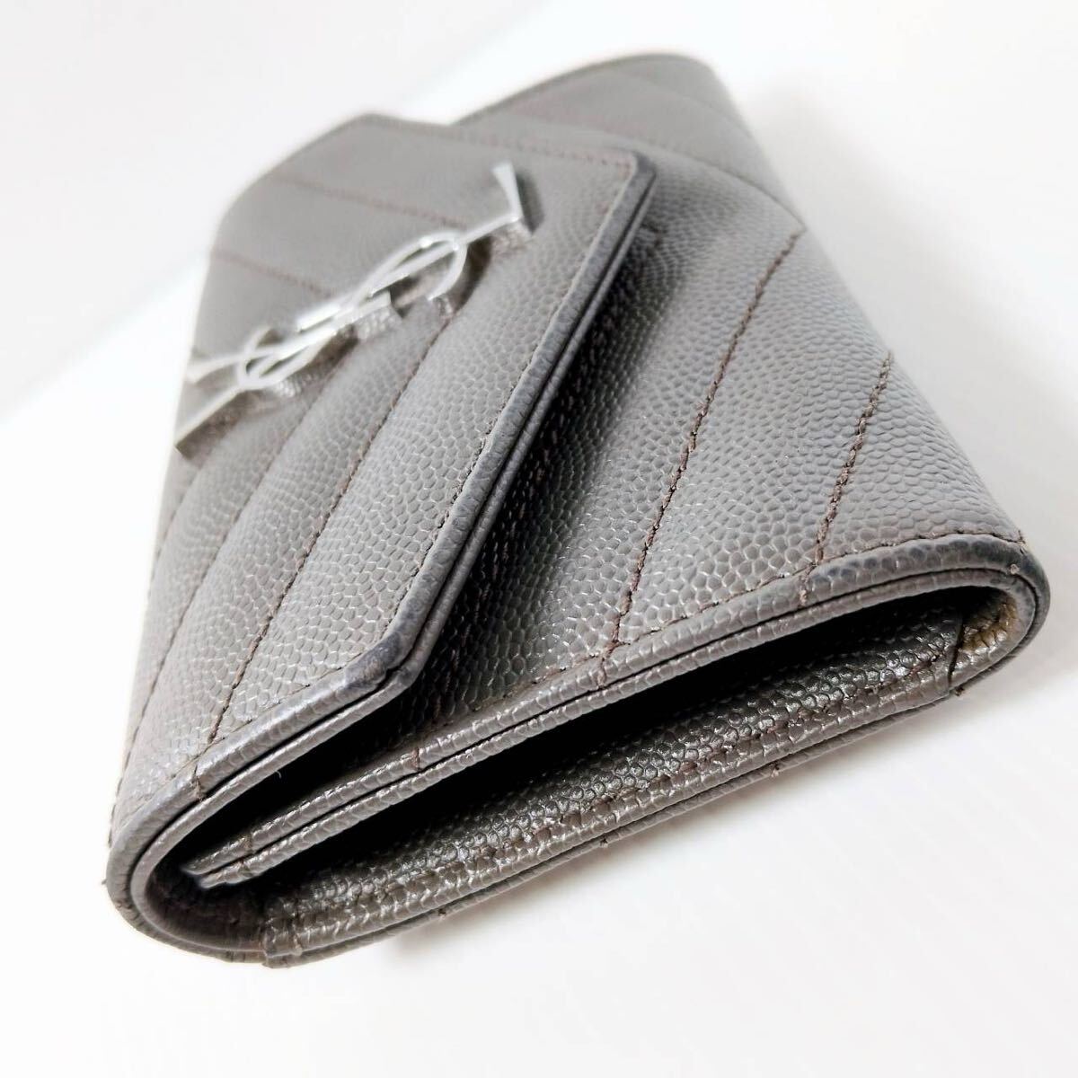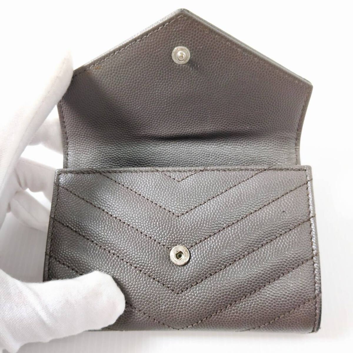 YSL イヴ・サンローラン カードケース グレー レザー SAINT LAURENT PARIS Vステッチ 三つ折り財布 ミニウォレット レディース メンズ