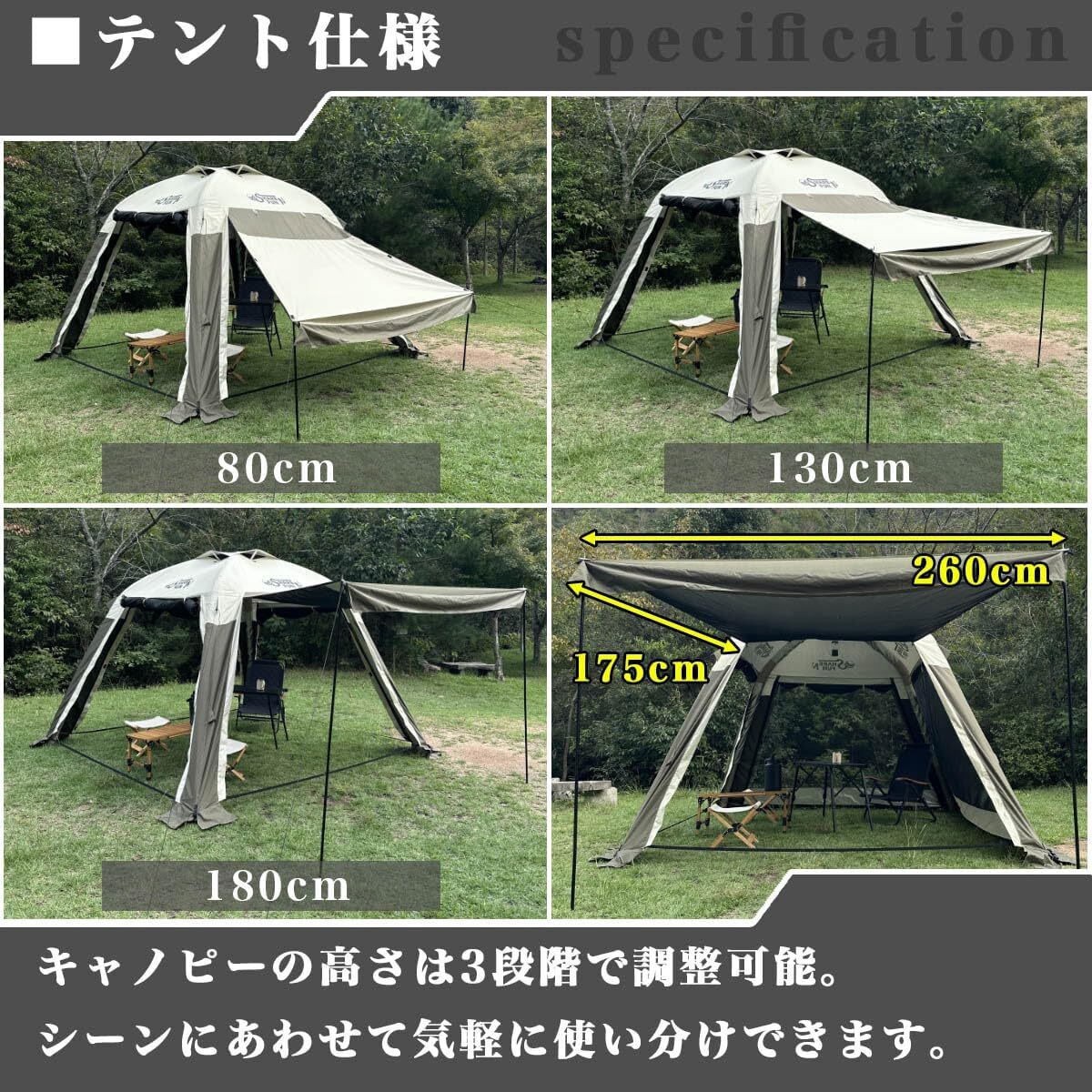 • 【キャノピー機能】それぞれの入口はキャノピーとして使用可能。どこでも好きな面をキャノピーとして使用すればさらに快適なアウトドアライフが楽しめます。全方向(4面)をキャノピーとして展開することも可能(別途タープポールが必要)。