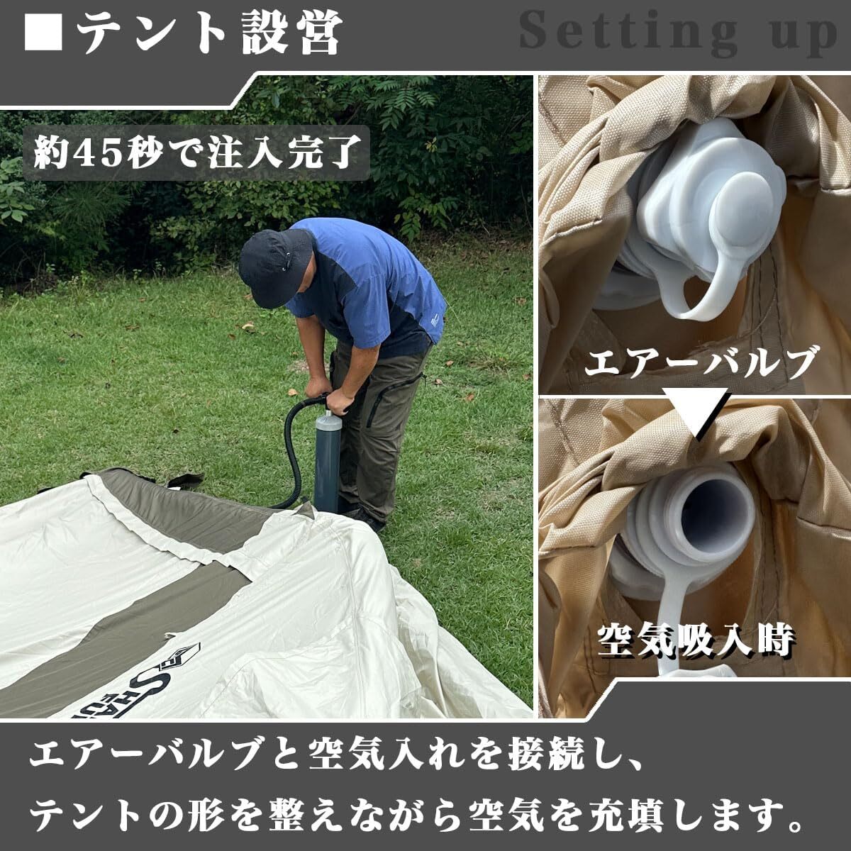 • 【エアフレームタープテント】空気を入れるだけで設営できるお手軽テント。ドームテント、タープテント、スクリーンテントの3つの機能性をもったハイブリッドテントなので様々なシーンに対応できてなおかつ簡単設営、コンパクト収納、軽量で持ち運びもとっても簡単。