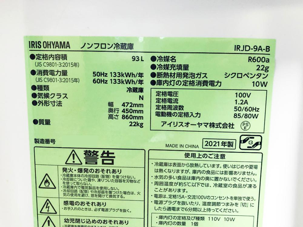 ★引き取りの大歓迎!! ご本人様が直接引取の場合、2,000円値引きます!! 是非お越しください♪ ★お取り置きOK!★ 3ヶ月間までは、無料でお取り置きできます! もしそれ以上の期間をご希望の方は、事前にご相談ください♪ 送料無料★2021年製★極上超美品 中古★IRIS OHYAMA 93L 幅47.2cm★温度調節6段階!!庫内灯付き★1ドア右開き冷蔵庫【IRJD-9A-B】FOVX ※棚・ポケットなど、写真に写しているものが全てです。 ◆動作確認は、しっかり長時間(2~3日間)行っており、冷えも良好で問題ございません。 ◆他に多数出品しており掲載写真をご覧いただければわかりますが、 細かすぎるかもしれませんが、私が気が付いたキズ等に関して、できる限りアップ写真を掲載しております。 こちらの商品に関しては、私が見る限りで申し訳ございませんが、傷や汚れ等なく、全体的にはとても綺麗で、極上超美品だと思います。 ※但し、中古品の為、私の気づかないキズ・汚れ等あるかもしれませんので、気になる方はご遠慮ください。 是非、ご検討をお願いします。 【商品説明】 デザインはシンプル、ボディはコンパクト。どこでも使える冷蔵庫です。 1人暮らしはもちろん、リビングに置く2台目としても。 お部屋にも合わせやすいブラックと、ホワイトの2色。 ガラス棚3枚+クリアケース4L。 ガラス棚は丈夫で傷付きにくく、お手入れも楽々。 クリアケースには、かさばる野菜や果物などをまとめて収納。 透明だから中身も見やすい。 ドアポケットには350mL缶、500mL缶、 2Lペットボトル、1L牛乳パックが入って収納力抜群。 庫内灯、温度調節6段階つまみ付き。 28dBの静音設計で、生活空間に置いても音が気にならないほど静か。 ※騒音値の目安:20dB/木の葉の触れ合う音、30dB/ささやき声、深夜の住宅街 省エネ基準達成率143%。※目標年度2021年度 市販の転倒防止ベルトを取り付けて、壁に固定できます。 ※設置時のご注意 ・本製品は右開きです。 ・右側はドアが開くようにスペースを5cm以上取ってください。 ・右側に壁がある場合は31cm以上空けてください。 スペースがないと、お手入れ時に棚が取り出せません。 ●種類:ノンフロン冷蔵庫 ●冷却方式:直冷式 ●冷媒:R600a ●商品サイズ(cm):外寸:幅約47.2×奥行約45.0×高さ約86.0 ●質量:約22kg ●定格電圧(定格周波数):AC100V(50/60Hz) ●定格内容積※1:約93L ●電動機の定格入力(50/60Hz):85/80W ●ドア開閉方向:右 ●コード長:1.8m メーカー:アイリスオーヤマ 製造:2021年 詳しくはこちら↓ https://www.irisohyama.co.jp/products/electrical-appliances/large-appliances/refrigerator/refrigerator-1door/refrigerator-93l-irjd-9a-w-b ◆動作保証しておりますので、商品到着後3日以内に落札後の商品お取引画面から、動作不良等の内容をメッセージ連絡頂きましたら、初期不良対応は致します。但し、電源が入らない、全く稼働しない致命的な不具合に限ります。 ◆簡易清掃を行っております。 当方としては、清掃を行っておりますが、あえて簡易清掃と言わさせていただきます。 神経質な方や、新品同等のレベルをお求めの方、気になる方はご遠慮ください。 ◆その他、素人なりに慎重に確認したつもりですが、中古品の為、私の気づかない傷や汚れ等あるかもしれません。 専門的・神経質な細かな点までの対応はできませんので、基本的にノークレーム・ノーリターンでお願いします。 ※下記内容を最後まで、必ずお読み下さい。 ご入札・落札の際は、ご了承頂いたものとみなします。 注意事項★☆★☆★☆★☆★☆★☆★☆★☆★☆★☆★☆★☆★☆★☆ ●ヤフオクシステム改定に伴い、「 受取連絡 」が非常に重要となりますので、商品到着後24時間以内に受取連絡された方のみ、初期不良対応・保証対象とさせていただきます。 ●私としてで申し訳ございませんが、できる限り誠意ある対応を心がけているつもりですが、顔の見れないお取引が故に色々な方がおり、また人それぞれ感性など異なりますので、ところどころ、あえてと記載させて頂いております。 ●初期不良対応・保証に関して、お届け先へ商品到着後、3日以内が保証対象となります。 ●商品が届いたご住所で動作確認等行ってください。移動しますと保証対象外になります。 ●万が一、商品に不具合等がございましたら、落札商品お取引画面から具体的な不具合等の内容をメッセージして下さい。商品到着後、3日以内メッセージを頂けていない場合は、保証対象外となりますので、必ずお願いいたします。 ●家電に関しては、あえて、電源が入らない・全く稼働しないなどの致命的な不具合、家具類など電気を使わないものは、その物として成り立たない物に限らさせていただきます。 ●動作確認・状態確認が終わるまで、梱包材・運送会社の伝票など必ず保管してください。保管されていない場合、初期不良対応・保証ができなくなる場合がございます。 ●運送事故の恐れがあった場合、所有権がお客様側に移っておりますので、お客様にて運送会社とのご対応をしていただく