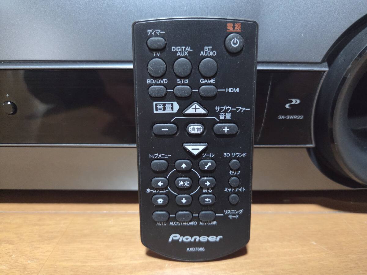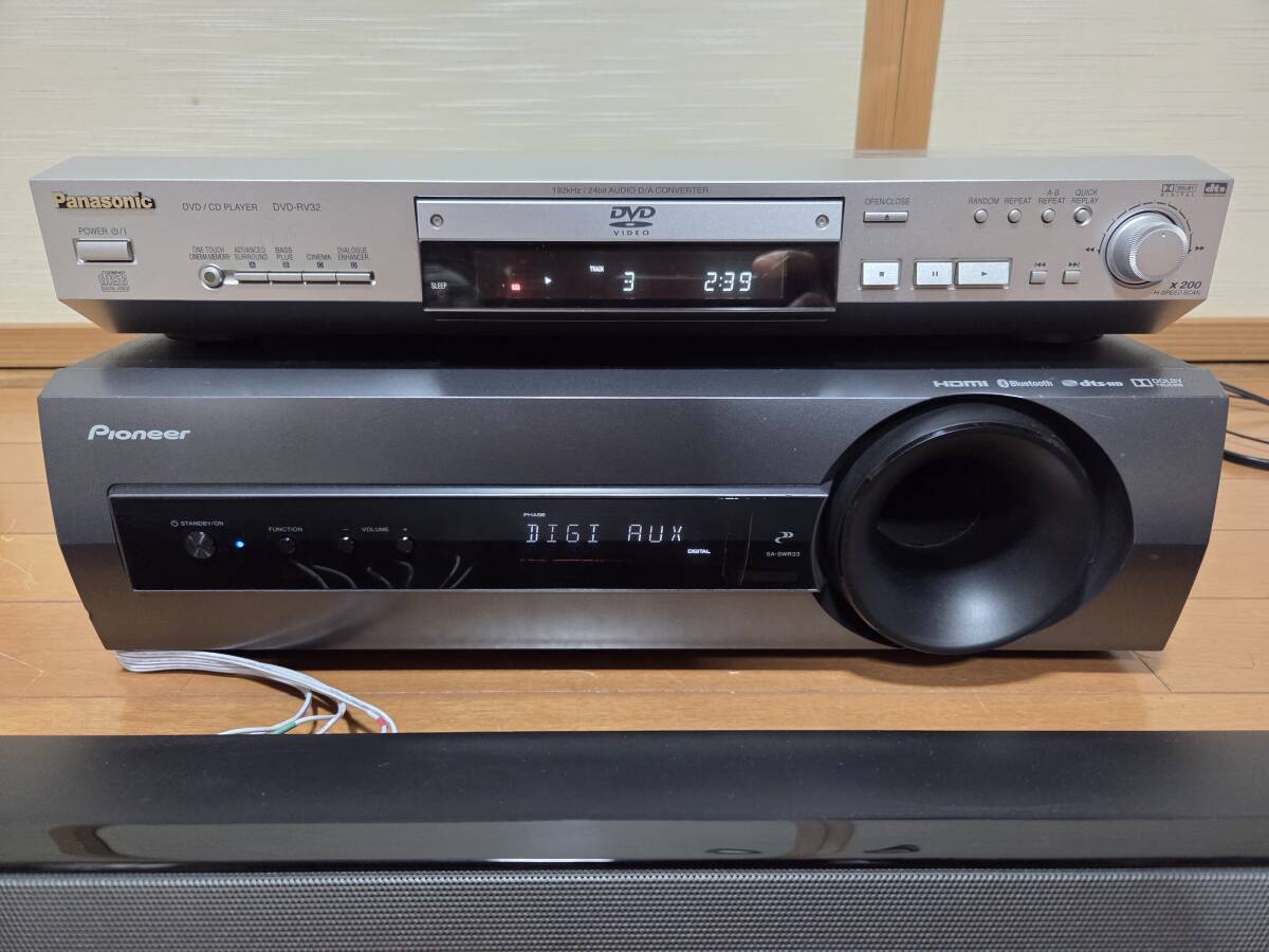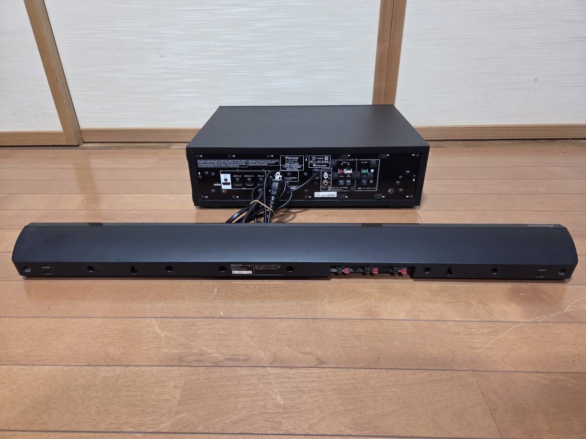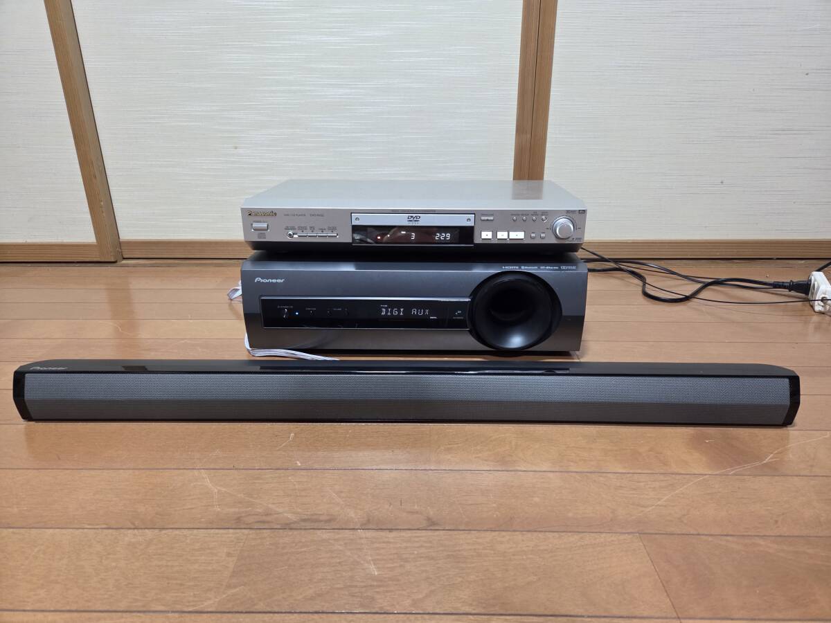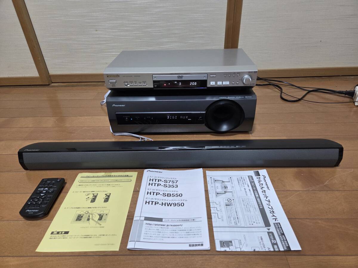 パイオニアのオーディオ/ビデオアンプサブウーファーsa-swr33、バースピーカーs-sb550、リモコンaxe7686、スピーカーケーブル、取説です。システム総称htp-sb550だと思います。画像の様にcd12分位、再生デジタル入力による音出し確認しました。リモコンは全てのボタンで発光する事を確認しました。発送はヤマト運輸の着払いです。中身を入れ換えてクレームを言う方が居ます、ノークレーム、ノーリターン、ノーサポート、現状品です。