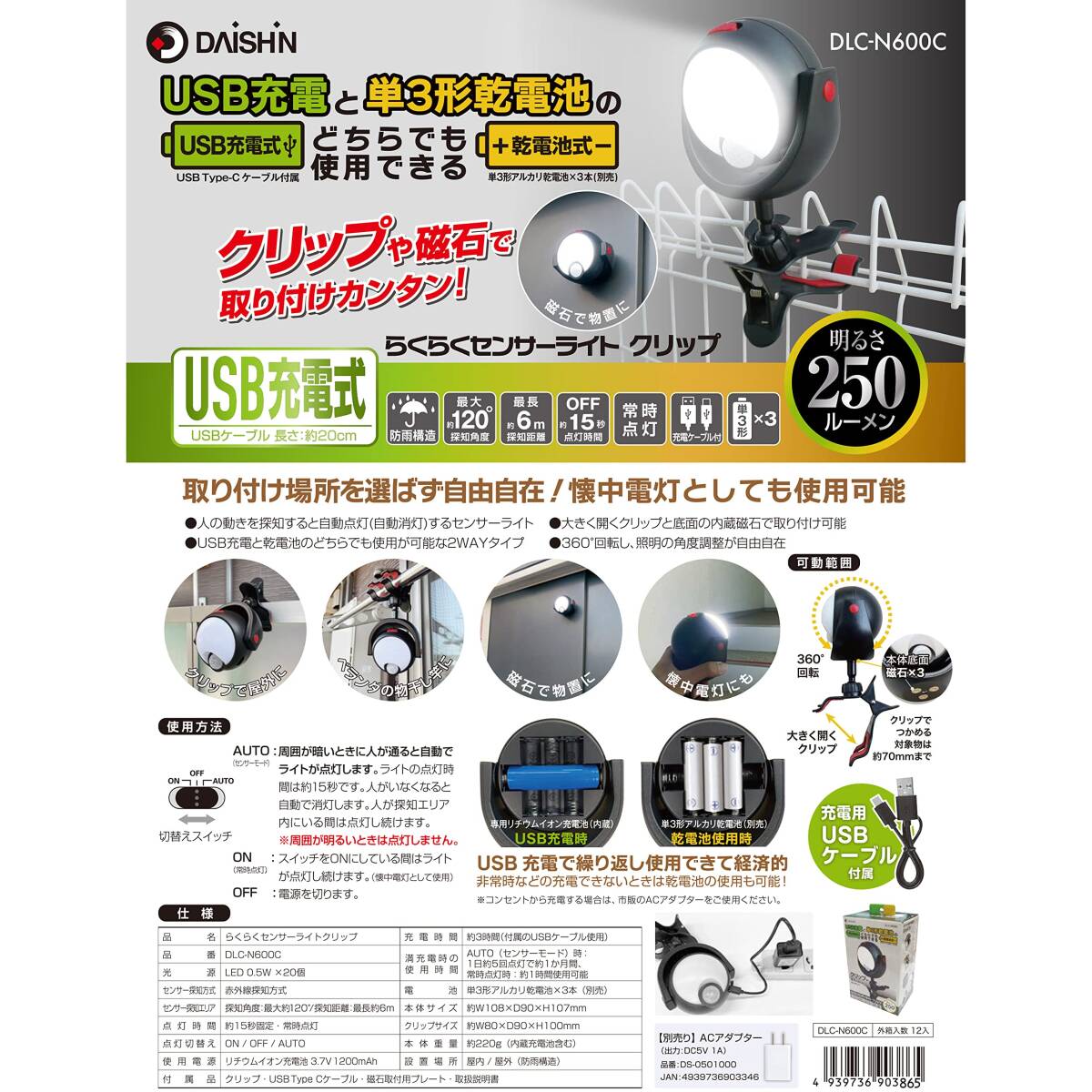 大進 らくらく センサーライト DLC-N600C クリップ USB充電 単三 単3 乾電池 3本 250ルーメン センサーライト 屋外 ソーラ