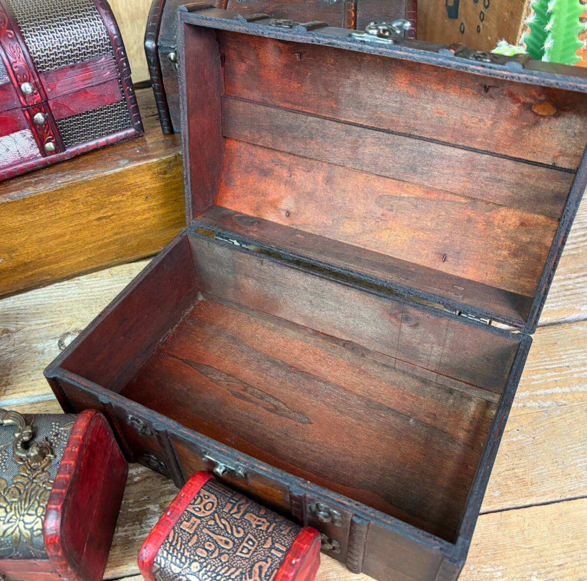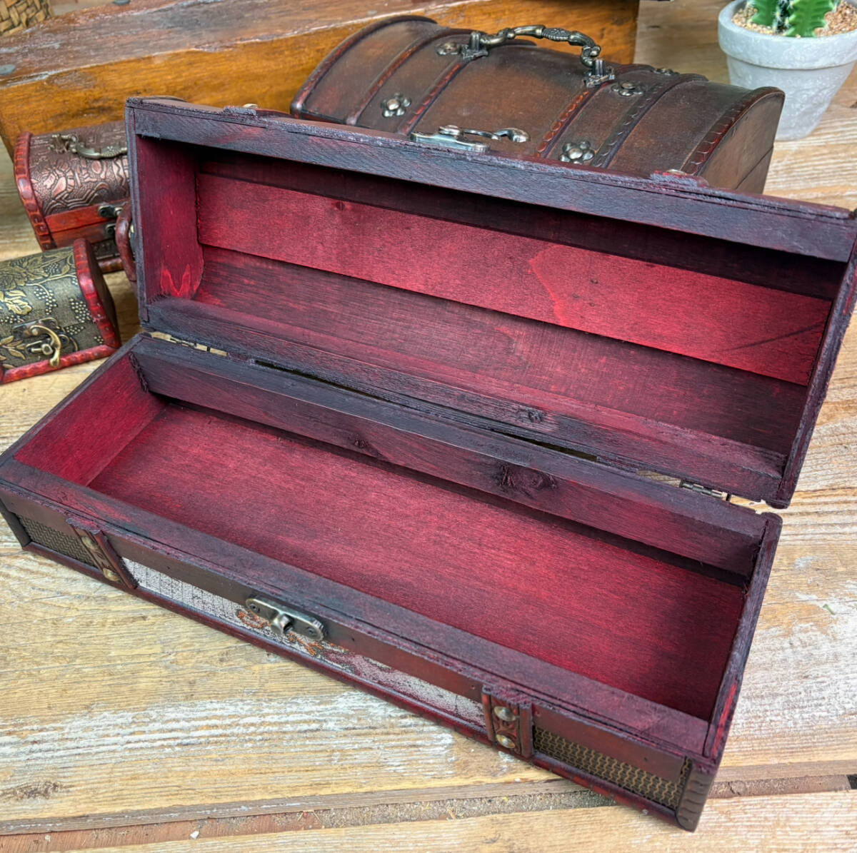 木製のカバン型小物入れの7点セットです。鍵フック付きでとてもおしゃれな木箱ケースです。小物入れにはもちろん、ガーデニングインテリア、置物、ディスプレイ、プランターなどにも使えます。レトロな宝箱デザインが素敵です。見ているだけで楽しくなる商品ですよ♪ヴィンテージ、アンティーク感もあるお品です。ぜひこの機会に♪