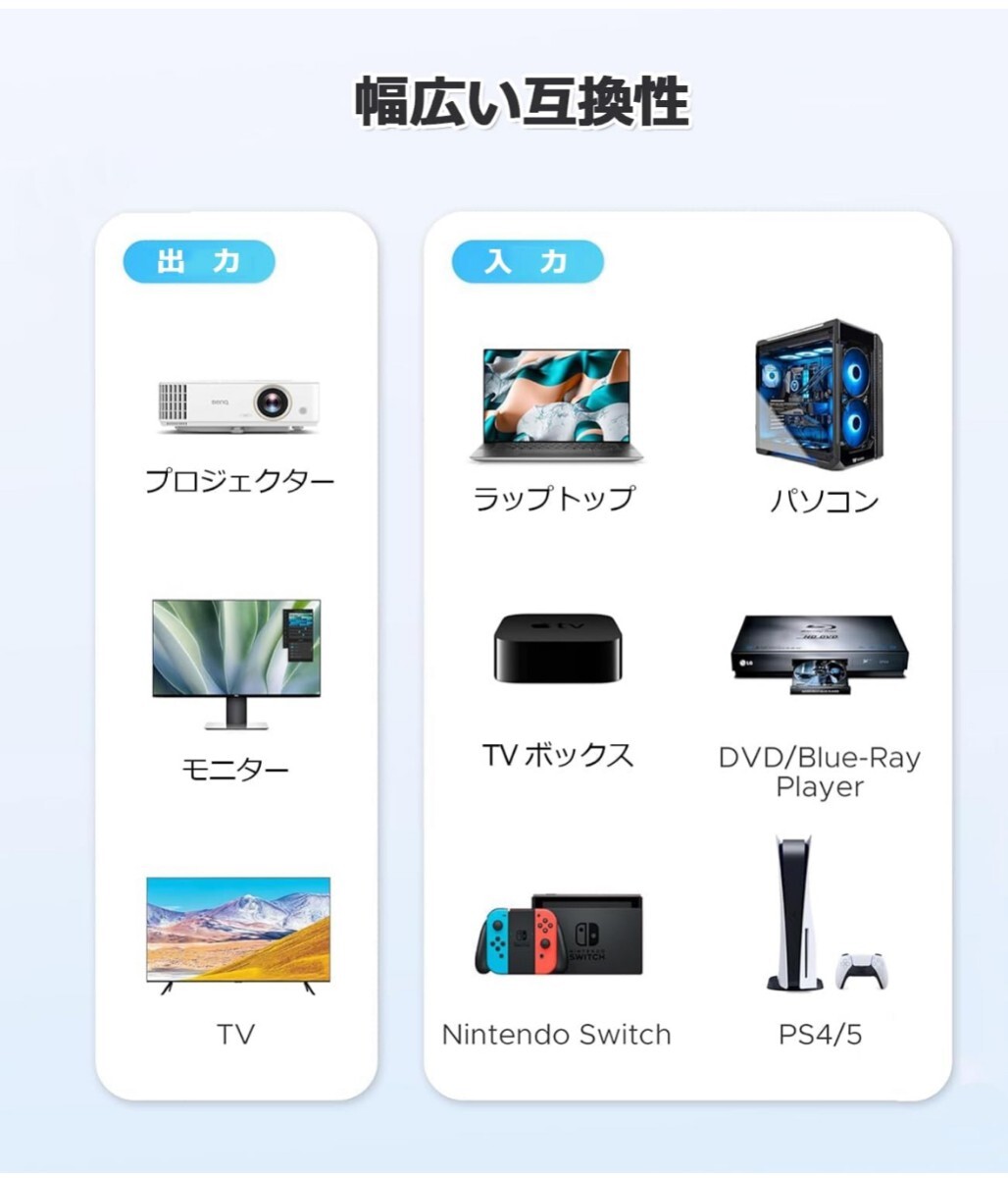 【多様な機器との互換性】 HDMIハブは、オーディオフォーマット(DTS-HD、Dolby TrueHD、LPCM7.1、DSDなど)の最新オーディオフォーマットを完全サポートしています。HDMI分配器の入力端子は、PS5、PS4 Pro、PS4、PS3、Nintendo Switch、Wii、Xbox、Fire TV、ラップトップ、Apple TV、DVDプレーヤーなどの幅広い機器に対応しています。また、HDMI出力端子は、テレビ、パソコン用ディスプレイ、プロジェクター、VRなどに対応しています。