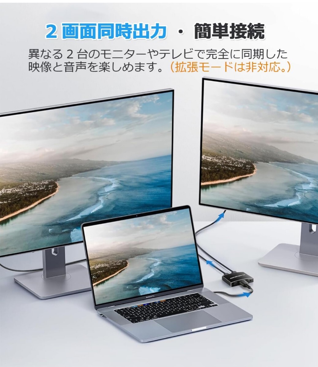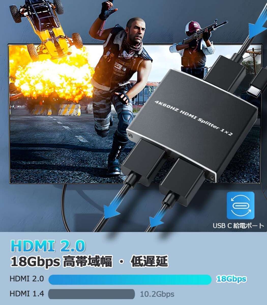 【1×2 HDMI2.0b分配器・2画面同時出力】 HDMI分配器 1入力2出力はHDMI信号を2台のディスプレイに同時分配できます!1つの入力信号(ゲーム機・パソコンなど)を2出力(テレビ・モニター・プロジェクター・VRなど)に複製/ミラーリングし、高品質な4K映像とマルチチャンネル音声をロスなく伝送。異なる部屋の2台のモニターやテレビで完全に同期した映像と音声を楽しめます。(拡張モードは非対応。)
