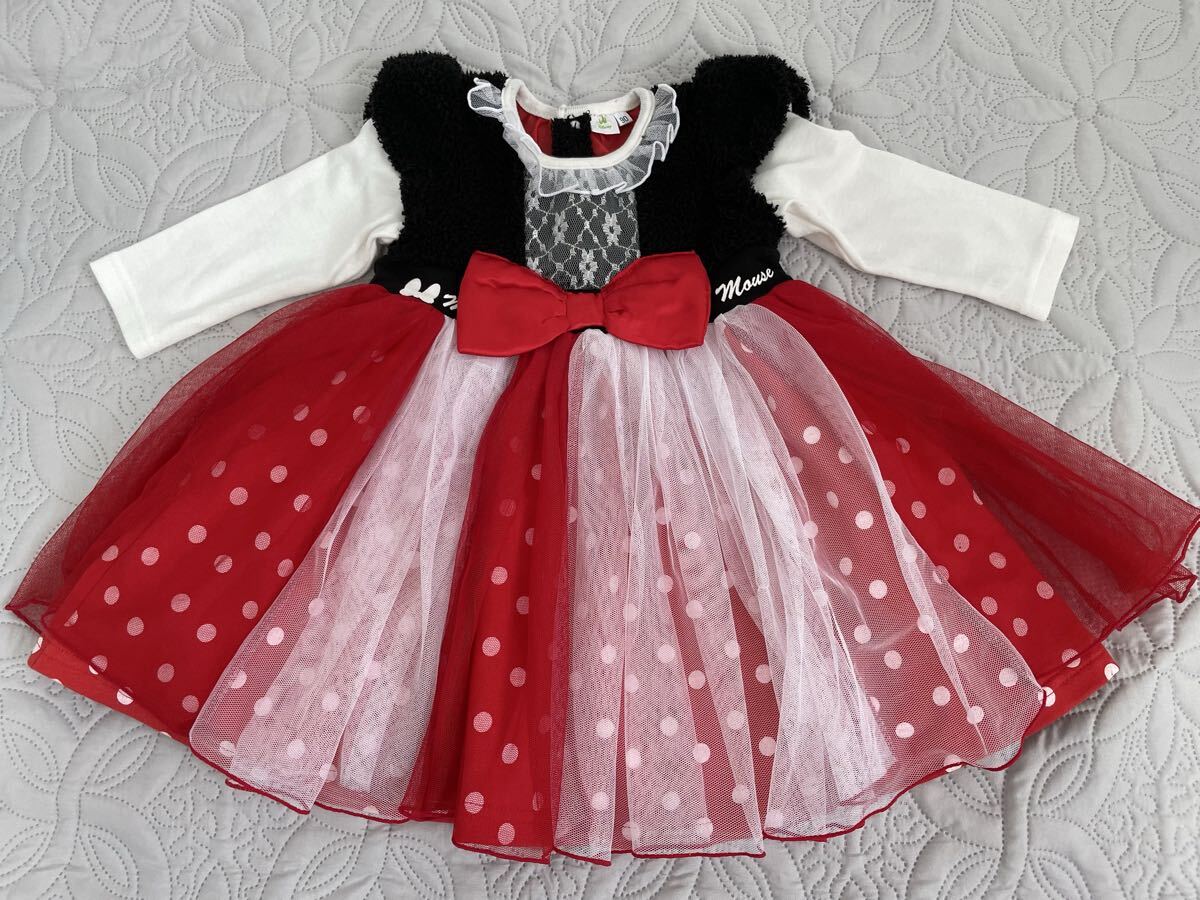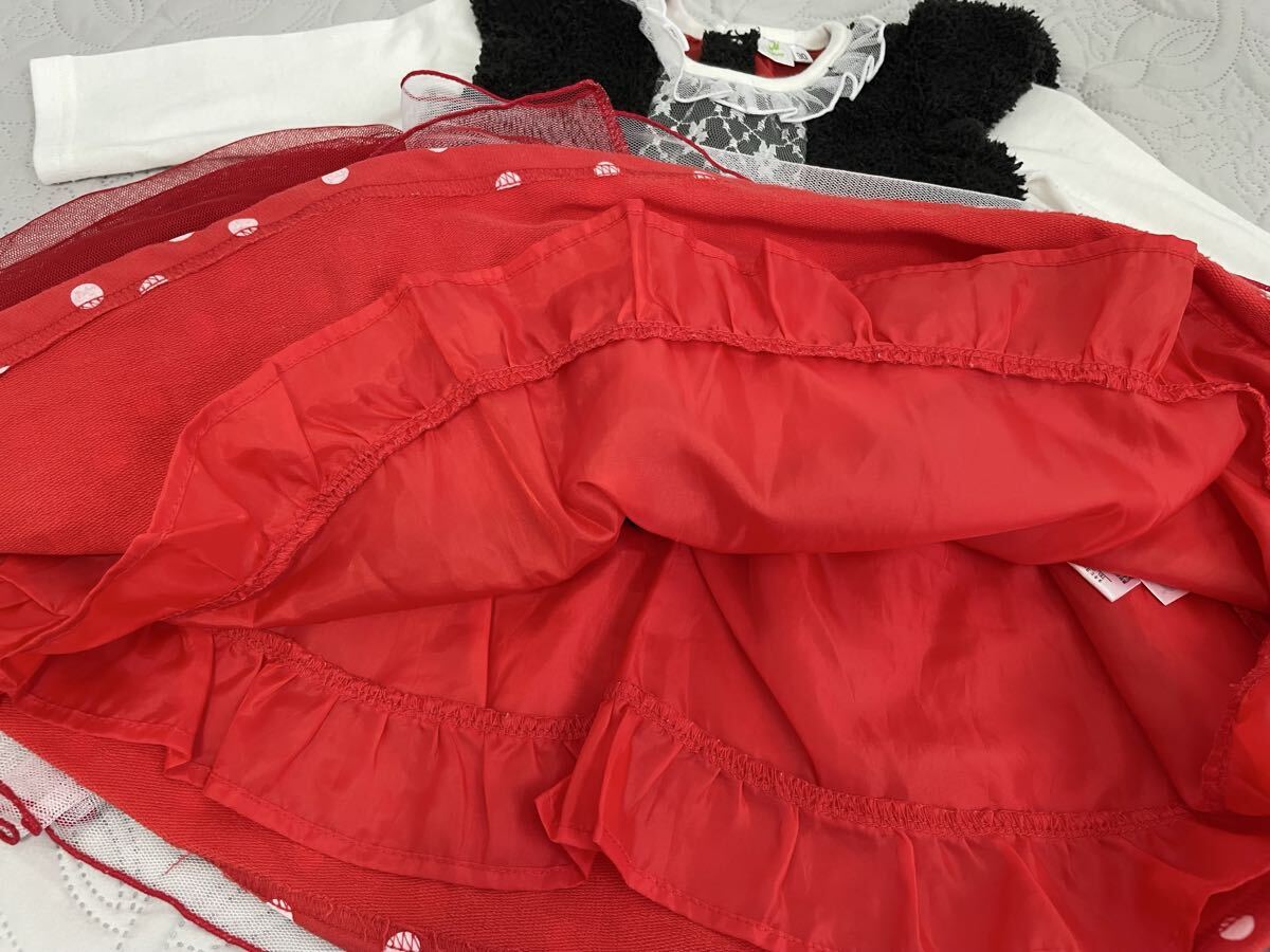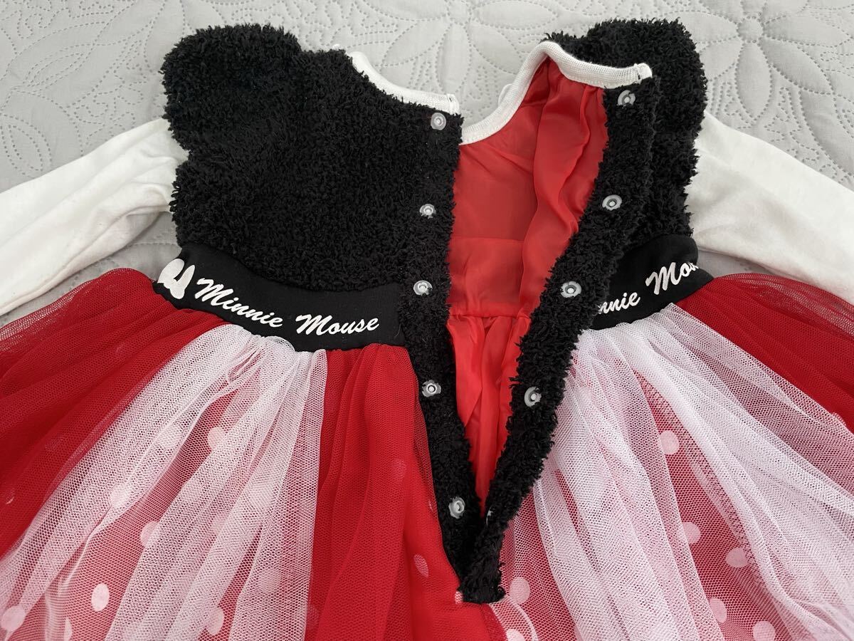used◆90◆ミニー 長袖ドレス 〔上部分・ボア重ね着風〕〔スカート部分・シフォン・T素材ドット柄〕裏地付き◆赤・黒系